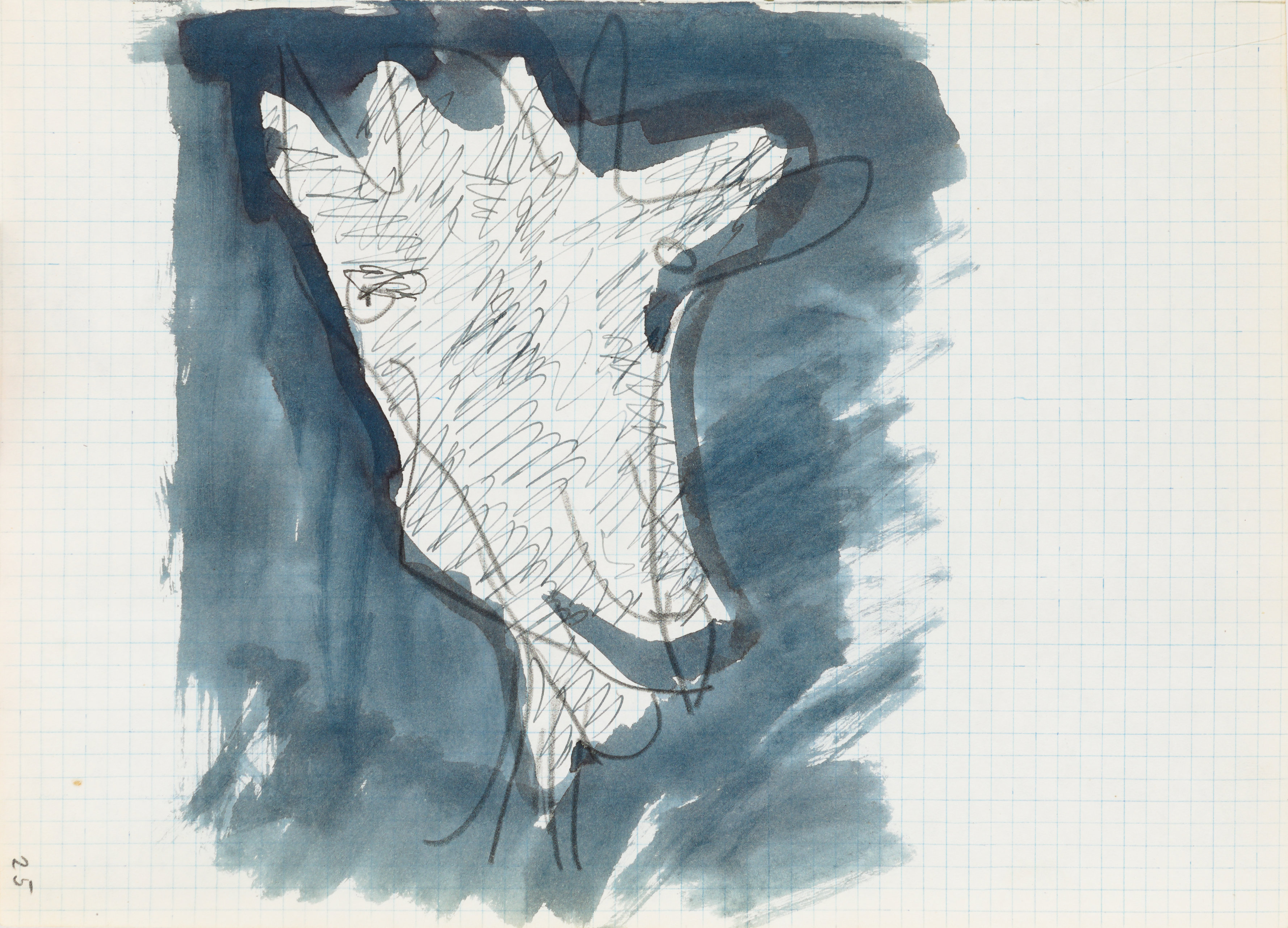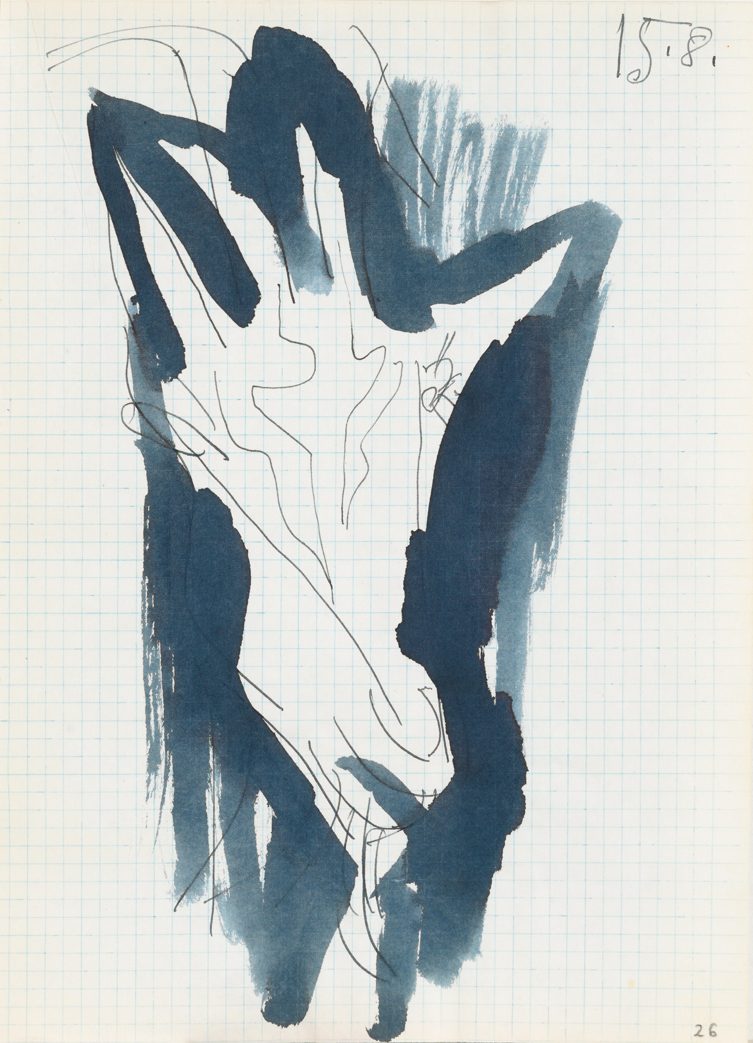 pędzel, pióro, atrament niebieski, tusz lawowany, papier lekko kremowy w kratkę jasnoniebieską; 29,3 x 21 cm.