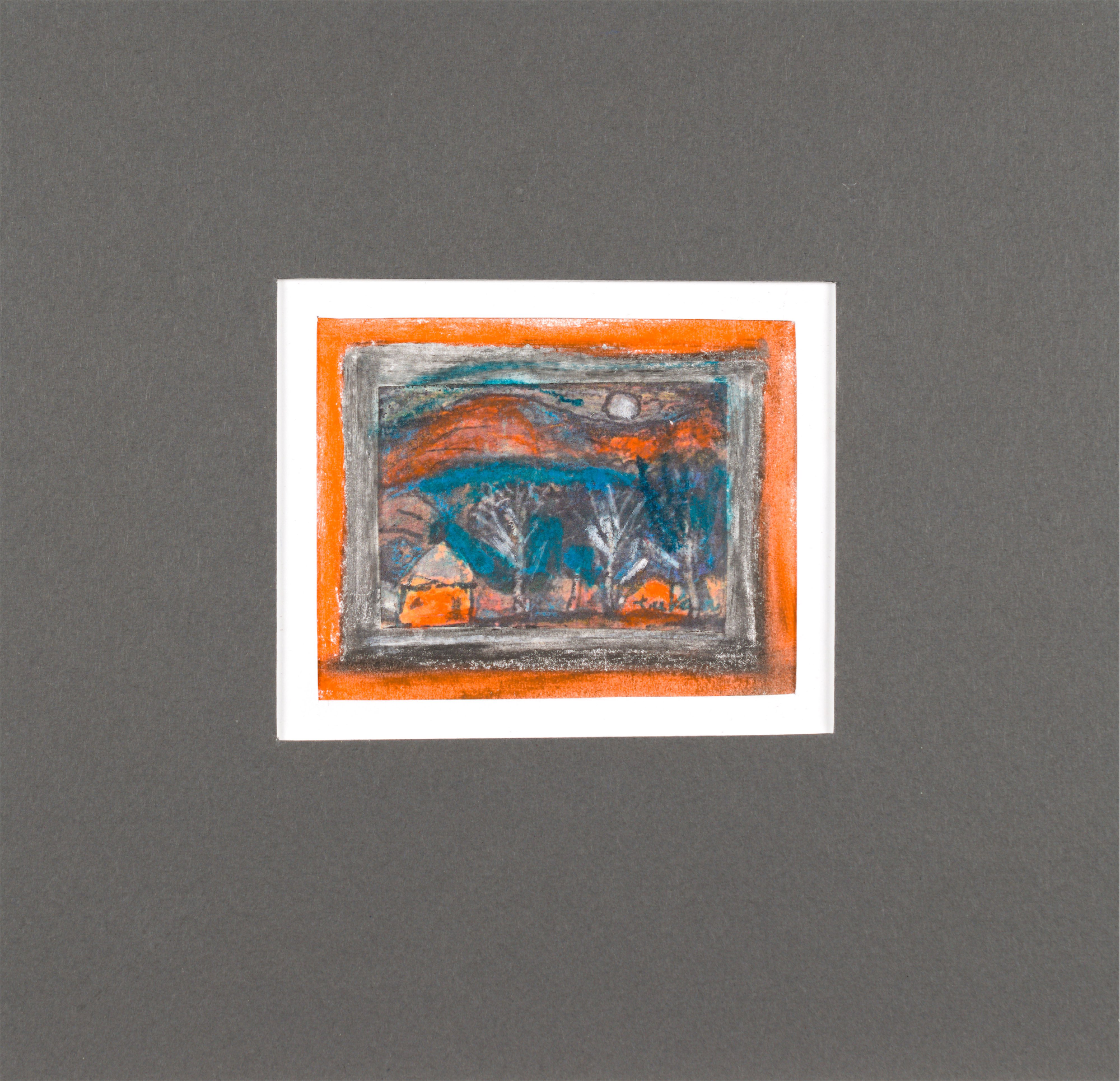 technika mieszana: tusz niezmywalny, olejna kredka, akwarela, akryl, papier; 7,9 x 9,6 cm (w św. passe-partout);