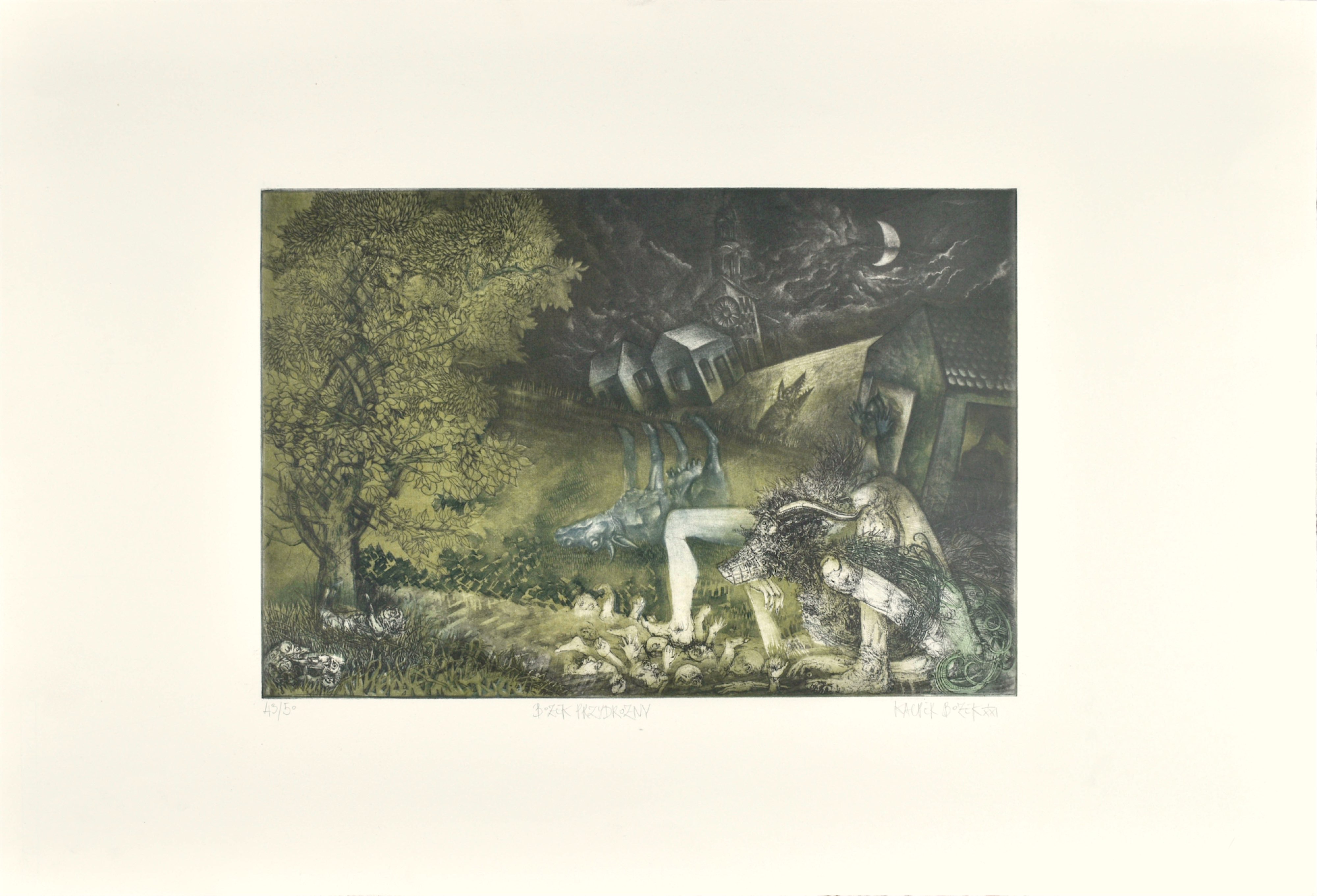sygn. p. d.: KACPER BOŻEK I/XXI (ołówkiem), tytuł. śr. d.: BOŻEK PRZYDROŻNY (ołówkiem) oraz numer. l. d.: 43/50 (ołówkiem).