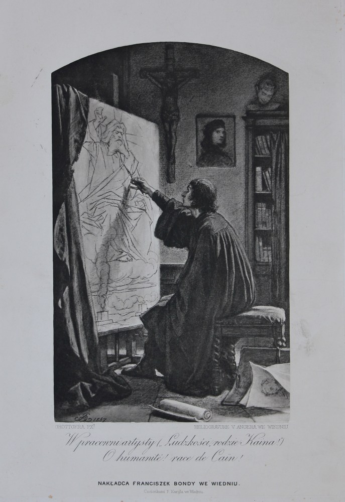 sygn. dat. na płycie l.d. AG 1867, oraz opis: l.d. GROTTGER PXT, p.d. HELIOGRAVURE V.ANGERA WE WIEDNIU, śr.d. W pracowni artysty („Ludzkości, rodzie...