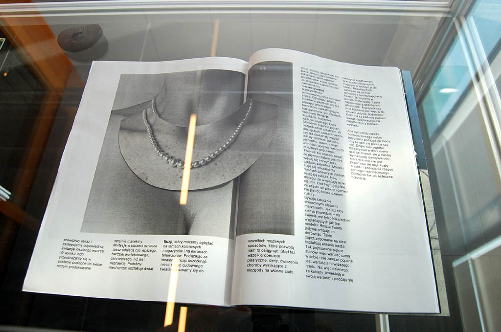Z pracami Dagmary Horab koresponduje tworczość Adriany Lisowskiej. Na potrzeby jej prac poszerzono przestrzeń galerii o boczne, przeszklone studio, które z jednej strony stworzyło odrębną przestrzeń, o laboratoryjnych konotacjach, z drugiej poprzez szklaną płaszczyznę ścian pozostawiło prace artystki w aktywnej korespondencji z resztą wystawy. Lisowska tworzy biżuterię, choć niewiele kobiet zdecydowałoby się ją nosić. Prezentuje ją w postaci obiektów, a także na fotogramach, dzięki którym możemy zobaczyć ich relację z ciałem modelki. Podobnie jak Horab, a także trzeci uczestnik wystawy Artur Malewski, Lisowska pracuje z tworzywami sztucznymi. Realizowane przez nią obiekty to odlewy fragmentów ludzkiego, przede wszystkim kobiecego ciała. Naszyjniki, kolie i brosze to skóra ściągnięta z szyi i piersi modelek. Przeźroczysta, trochę błyszcząca, bardzo atrakcyjna wizualnie, odnosi się stereotypu postrzegania kobiety, jako osoby która przede wszystkim powinna epatować urodą. Z drugiej strony przypomina o naszej cielesnej marności, przemijaniu i śmierci. Pokazuje, że piękno ciała to tylko nasz chwilowy atrybut, który w wyniku upływu czasu czy na skutek choroby rozsypuje się w proch, i to zawsze za szybko, za wcześnie. Lisowska w swoich pracach, także poprzez tworzywo, nawiązuje tu do twórczości Aliny Szapocznikow, a filozoficznie bliższa jest może nawet różowym obiektom Marii Pinińskiej-Bereś. Jednak jej biżuteryjne ujęcie to bardzo indywidualny wkład w tę tematykę, określający indywidualność artystki.
