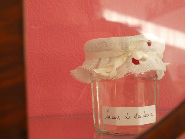 Ciekawym elementem wystawy są wspomniane już wcześniej meble, które wytwarzają przytulny klimat. W serwantce artystka umieściła słoiczki ze łzami. Wszystkie o przyozdobionych wieczkach. Są tu łzy wzruszenia, łzy radości, łzy rozkoszy, łzy rozczarowania, łzy smutku czy łzy szczęścia. Z kolei w gablotach artystka umieściła fragmenty dzienników.