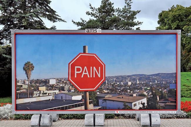 Znaki STOP - cykl przygotowany na Biennale Kalifornijskie w 2008 roku, składa się ze znaków drogowych o kształcie znaku STOP, w które wpisano słowa takie jak „nienawiść” czy „strach”. Dzieło to symbolizuje obszar pogranicza, zamkniętą strefę, rządzącą się prawami przemocy – krainę ograniczeń, nienawiści i strachu. 2 dzieła z tej serii można było zobaczyć na ubiegłorocznym festiwalu Art Moves.