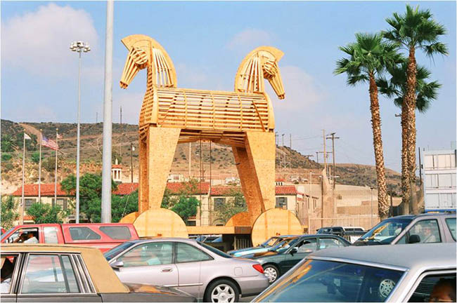 Koń trojański na biegunach to monumentalna drewniana rzeźba dwugłowego konia, stworzona w oparciu o homerycki opis Konia Trojańskiego w Iliadzie, jest pracą bezpośrednio wskazującą na problem meksykańsko-amerykańskiego pogranicza. Drewnianego konia na kółkach umieszczono na wysepce na San Ysidro – zatłoczonym przejściu granicznym pomiędzy meksykańską Tijuaną a amerykańskim San Diego. Praca podejmuje problem inwazji i współzależności, zderzenia i przenikania się dwóch kultur. Jedna z głów konia skierowana jest na południe, w stronę Meksyku, druga na północ, w stronę Stanów Zjednoczonych. Przedstawienie Konia Trojańskiego jako istoty z dwoma głowami ma zadanie ukazać skomplikowane relacje pomiędzy dwoma krajami, w których nie jest do końca oczywiste, kto dokonuje inwazji na kogo.