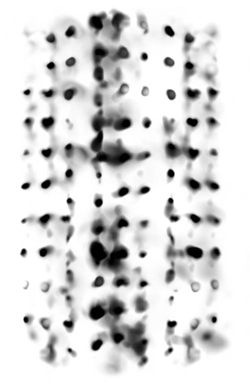 Ideogramy w dużym formacie (200 x 130 cm) rzucone na płótno w technologii cyfrowej są odbierane jako byty zawieszone na krawędzi swojej tożsamości pomiędzy tym, czy może były w naturalnej przestrzeni, a tym, czym teraz są jako sztuka. Balans przestrzenny sprawia nową strukturę istnienia. Artystyczna imaginacja narusza substancjalność przeniesionych do dzieła obiektów i odsłania jakieś "więcej". One są uszykowane do ulatywania dalej i dalej w abstrakcję, uruchamiają intelekt. Umysł musi zapytać o te plamy wibrujące, o fenomen obecności, o kompozycję, w której wiążą się ze sobą elementy z pozoru niezależne. Zniuansowane nasyceniem koloru znaki pokazują równocześnie oddalanie oczywistości i możność budowania całości, która znów będzie istnieć dla siebie, pozostając dla rozumu obła, niedostępna analizie. Tracąc wyrazistość konturu plastycznie chwytane sygnały bytowe wyzbywają się narracji, to znaczy, że nie pozwalają przypisać im tożsamościowych jakości. SĄ. Bez parametrów i bez ikonografii. Lekkie, wolne, osobne. Nie mają nazw, więc nie należą do żadnego wykształconego przez dotychczasową kulturę porządku ludzkiego świata. Plan widzenia znajduje się we wnętrzu widzialnego obrazu, ujawnia jakiś niezidentyfikowany stan w procesie przemiany, tranzytu, grawitacji. Te widoki nie mają znanej ontologicznej legitymacji, raczej projektują niepewną przyszłość. O wszystko trzeba razem z autorką pytać od początku, nie oczekując odpowiedzi. Wypromieniowana z obiektów/znaków przestrzeń uwodzi ambiwalencją, generuje jeszcze niepojęte wymiary. Być może najbardziej przydatny jest tu termin "spacing" Jacquesa Derridy. Oznacza on siłę otwierania na inne jakości. Przestrzeń w tym rozumieniu nie jest interwałem między dwiema rzeczami lecz ruchem, stawaniem się różnym od niej samej. Żadnej pewności do końca. Rzecz znajduje się na granicy swojego istnienia i sugestii. Coś się dopiero ukaże albo nie objawi się wcale?