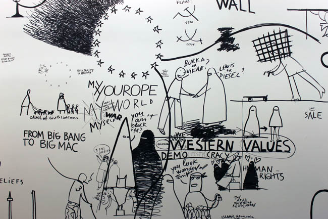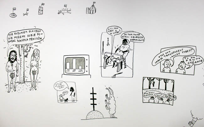 Oprócz czarno-białej kolorystyki prace łączy niezwykle prosty społeczno-polityczny przekaz. Operowanie linią pozwala twórcom na łatwiejsze pokazanie prowokujących tematów i używanie symboli. Pokazane na wystawie komiksy i animacje są często dosadne, przerysowane, brzydkie, obsceniczne i prowokujące. Mimo to nie rażą, bo odbieramy je jako dowcip. Mają niejako przyzwolenie na ostry komentarz polityczny. „Może nie zawsze sprawiedliwy ale wyrazisty, autentyczny i emocjonalny” - jak mówi jeden z kuratorów wystawy. Na ścianach MSN-u zobaczymy rysunki, które zostały wykonane specjalnie na tę wystawę. Niektóre tak bardzo spodobały się kuratorom, że postanowili zostawić je tu na stałe. W jednej z sal stworzono także niewielką przestrzeń czytelni, w której możemy usiąść i dowiedzieć się czegoś na temat prezentowanych artystów.