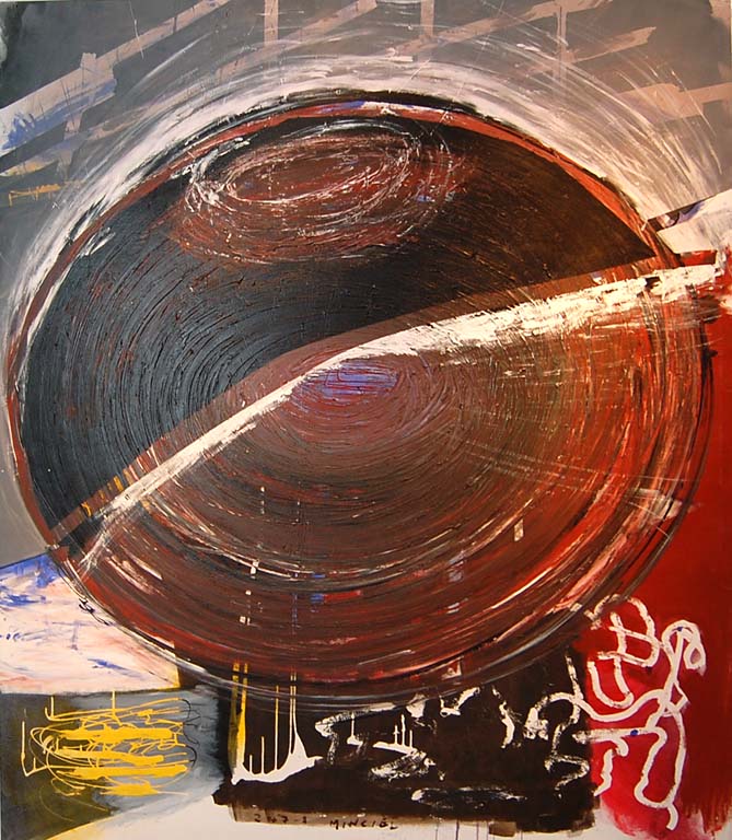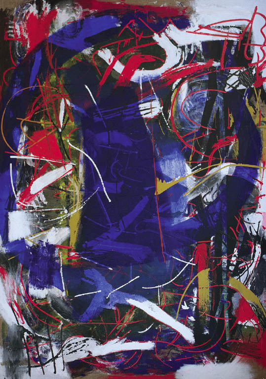 Energia zawarta w kolorze, jest siłą napędową obrazów. Ma się wrażenie, że prace są żywą tkanką, która pulsuje barwami. Geometryczne kształty to gesty artysty, jego sposób na wyrażenie emocji. Format prac również buduje napięcie, ogromne obrazy przyciągają uwagę (185x180, 206x270).