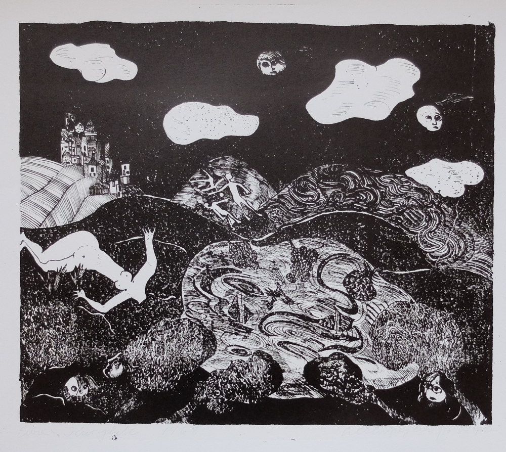 Równolegle do wystawy trwającej w krakowskim Muzeum Narodowym możemy delektować się wystawą prac na papierze Ewy Kuryluk i towarzysząca jej książką, stanowiąca katalog i zarazem opracowanie twórczości artystki z lat 1959-1975. Graficzny dorobek imponuje biegłością warsztatową, wielką swobodą wydobywania wszystkich niuansów litografii, wzbogacanej kolażem, dodanym kolorem, dobranym barwnym tłem. Rysunek białym tuszem na czarnym papierze misternie opracowuje delikatne szczegóły bujnej narracji.