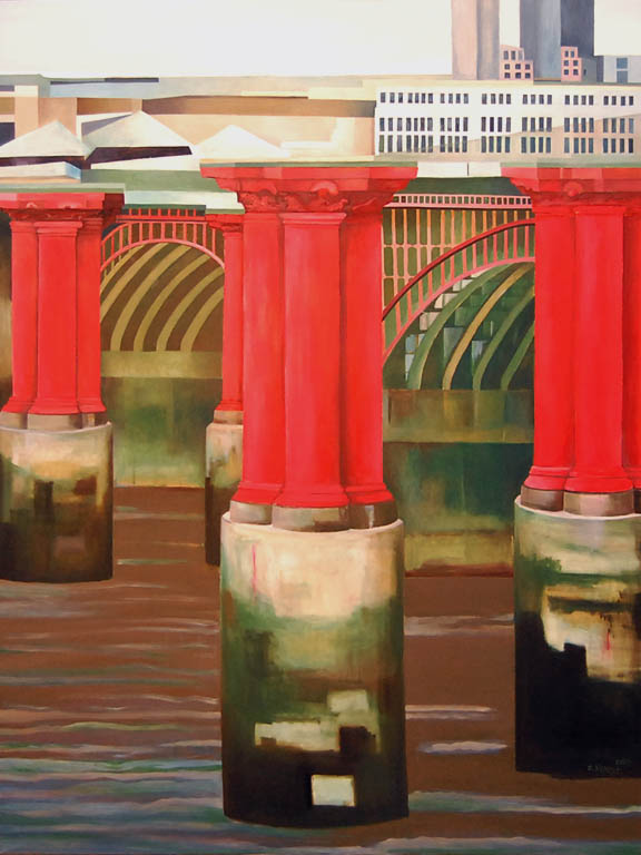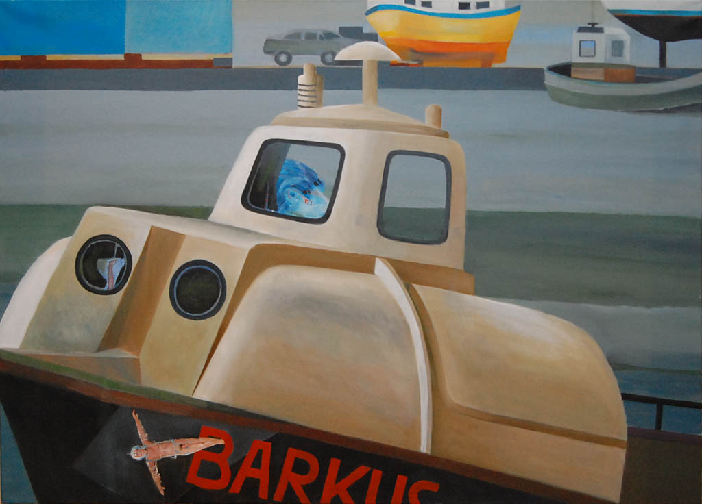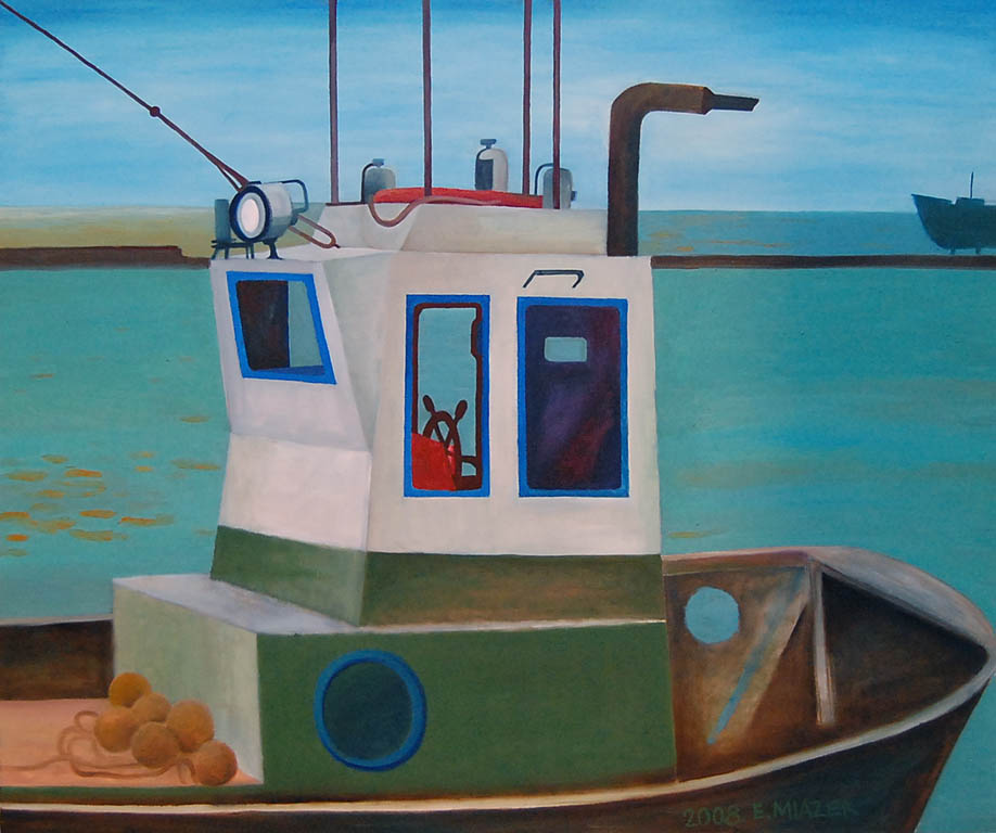 Drugim tematem, który pojawia się w obrazach Ewy Miazek są barki. Zauroczyły ją one już w dzieciństwie. Pływające po rzekach służą ludziom za środek transportu, schronienie, czy wreszcie stają się domami na wodzie. Chociaż na obrazach pojawiają się samodzielnie to zawsze z sugestią, że mają swoich właścicieli, lokatorów. Dym z komina, ruch w sterówce sprawiają, że patrząc na nie wiemy, że nie funkcjonują bez człowieka, który je zbudował i któremu służą do realizacji jego celów. Poza tym, szczególnie, gdy mają za sobą wiele lat na wodzie stają się wdzięcznym tematem malarskim. Patyna i rdza sprawiają, że zyskują duszę.