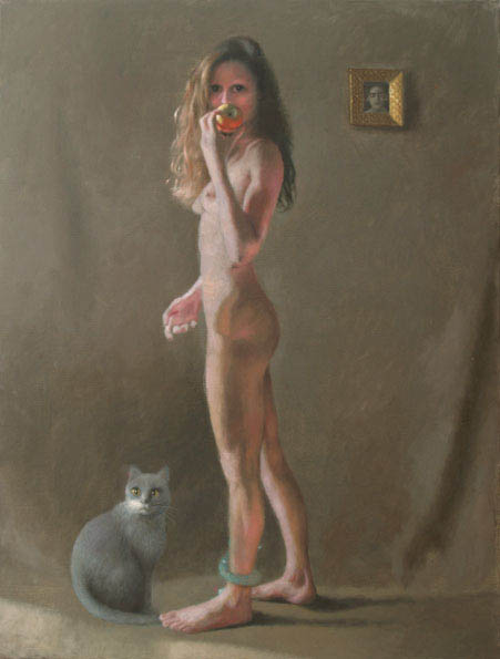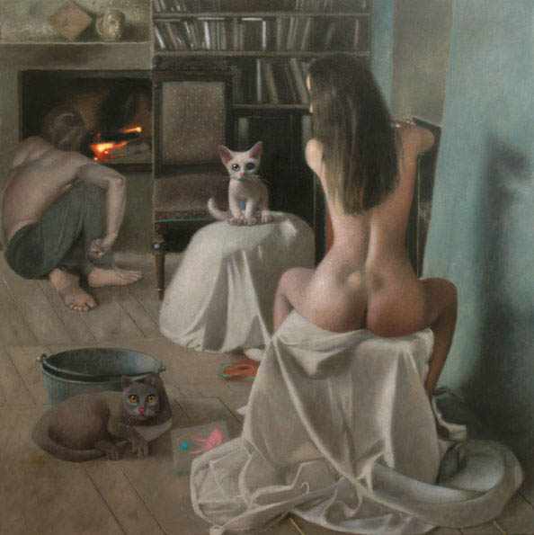 Ewę Pello interesują przede wszystkim dwa tematy - akt kobiecy we wnętrzu i martwa natura. Chętnie je łączy, zaludniając jednocześnie powierzchnię płócien tajemniczymi postaciami kotów, które często patrzą się wprost na widza, sygnalizując swoją dezintegrację z przedstawianym motywem i odrębność w obrębie obrazu. Są tu znakiem tajemnicy, pozwalającym traktować kompozycje artystki umownie i nieco nadrealnie. Dzięki nim odbieramy w sposób dojmujący senną atmosferę przesyconą zapachem perfum i rozpoznajemy niecielesność i nieuchwytność snujących się po pomieszczeniu nagich, szczupłych i zwinnych kobiet, które nie mogą stać się obiektami erotycznego uniesienia, gdyż są nazbyt niedosłowne.