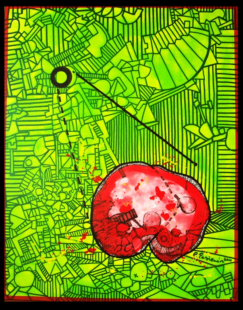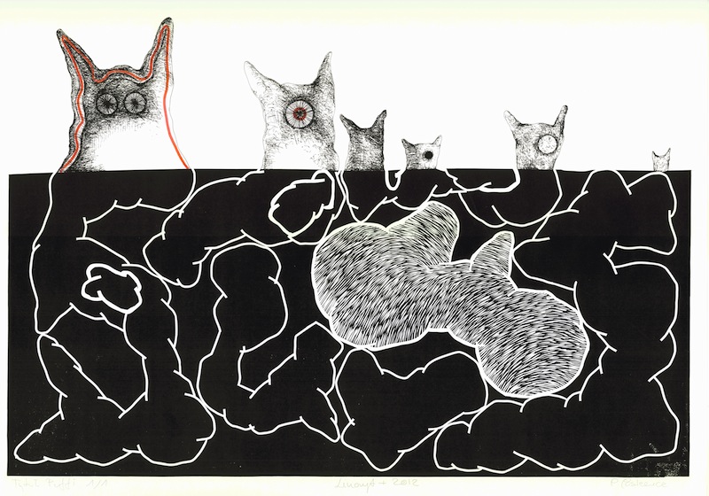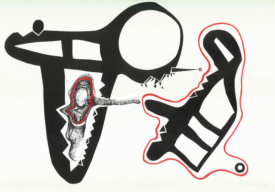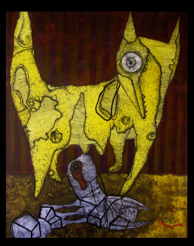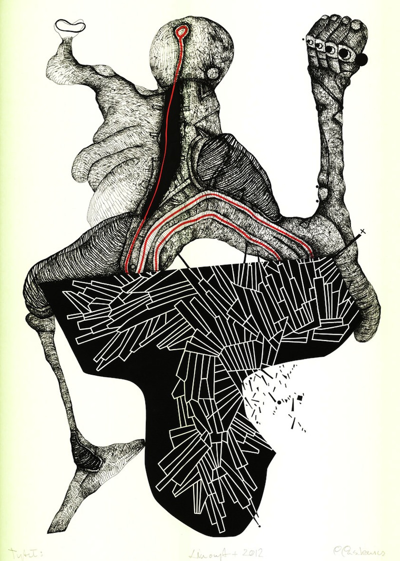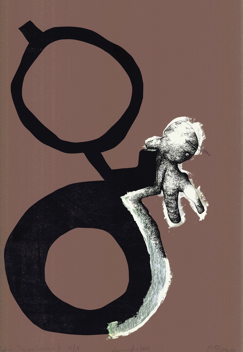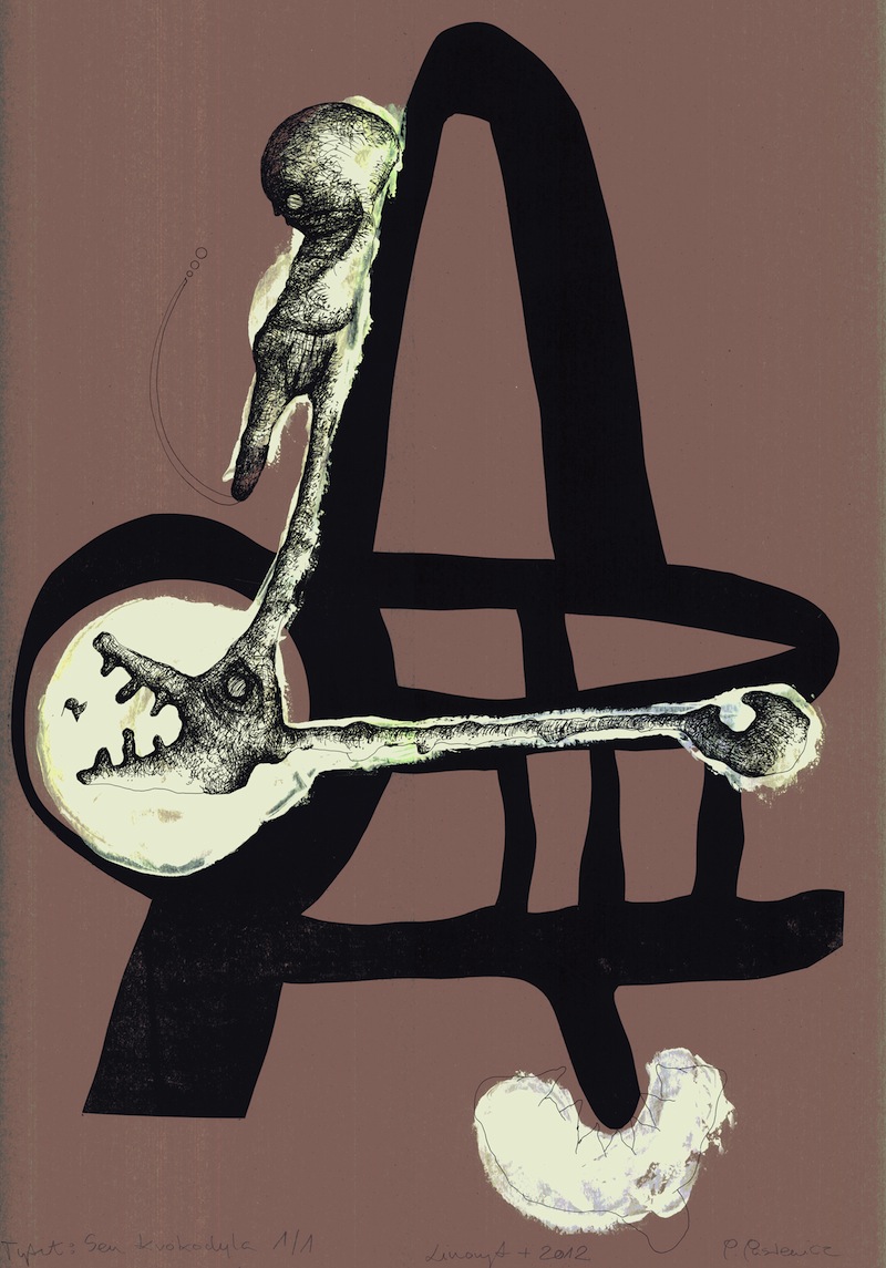 Tu znajdują się grafiki, w których twórca zderza ze sobą nie tylko linie i kształty. W tych pracach prowadzi grę pól pustych i zapełnionych, prostych znaków i skomplikowanych układów, czerni i bieli, różnych faktur. Czasami tło jest jednolite, „suche”, a innym razem przypomina szybę spływającą deszczem. Czerń przywodzi na myśl kamień, poprzecinany białymi żyłkami linii. Jest „zimna” i „twarda”. W przestrzeniach dzieł pojawiają się surrealistyczne istoty: plastyczni szarlatani, psychodeliczne zjawy. Mają uproszczone, owalne i wydłużone kształty. Wypełniają je cienkie, nagromadzone blisko siebie kreski. Dzięki nim te formy stają się lekkie oraz kruche. Materia, z której są zbudowane, jest „miękka” i gotowa na kolejne przeobrażenia. Wydaje się, że mogłaby się rozciągać i zwężać, niczym doskonała akrobatka. Część swoich szarlatanów artysta przewrotnie uświęcił żółtą poświatą koloru.