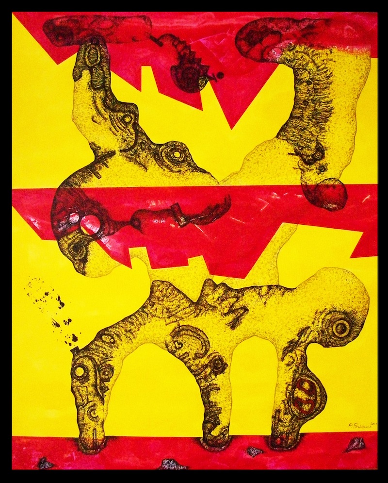 W pierwszym z nich uwagę odbiorcy angażują linie. Są giętkie i zwinne. Mimo że posiadają wyraźne kontury, to trudno jest rozdzielić ich splątane węzły. Wzór, na który się składają, nie jest logiczny, ani przewidywalny. Zawiera on różnorodne formy: geometryzujące i organiczne. Wiele z nich artysta zbudował na osiach diagonalnych. Niektóre pulsują czerwienią. Wszystkie te zabiegi sprawiają, że dzieła te cechuje dynamika, dramatyzm, namiętność. Stawiają one widza w stan gotowości na doznania zmysłowe w kolejnym pomieszczeniu.