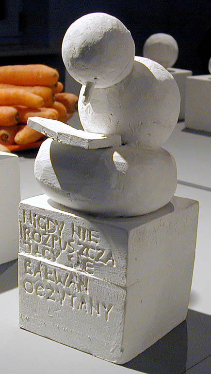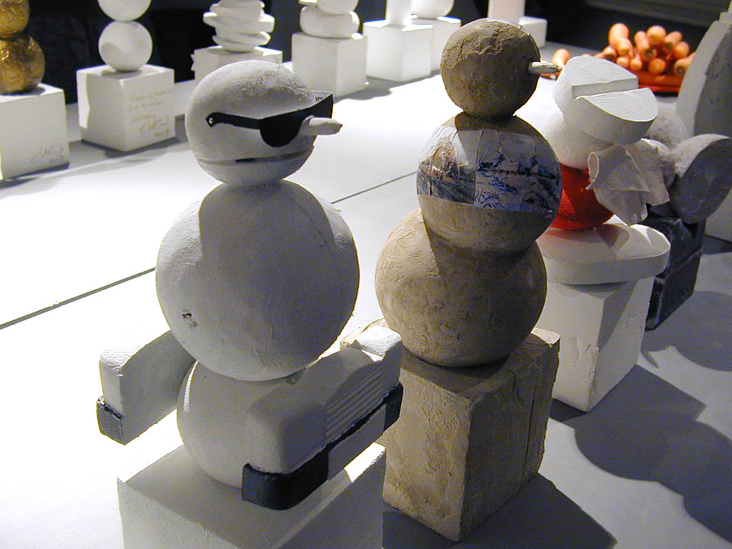 Autorka, osoba nie pozbawiona poczucia humoru o odcieniu nieco absurdalnym, stworzyła także specjalnie na tę prezentację cykl gipsowych rzeźb pod wspólnym hasłem "Bałwan dla Warszawy". Liczne zaprezentowane bałwany to makiety. Powstała idea, aby przynajmniej jeden z nich, powiększony do monumentalnej skali, został zrealizowany w stołecznej przestrzeni publicznej. Szanse na to są niewielkie, bo bałwany mają nieco kontrowersyjną tematykę. Jest w śród nich moherowy, cały czarny i włochaty, jest też farmaceutyczny, złożony z nadużywanych przez nas pastylek, kolejny to świąteczny nawiązujący do polskiego upodobania do świętowania, krzyżujący wielkanocne jajka z dynią z Halloween, kolejny to Gwiazdor sowiecko-amerykański, a są i inne. Bałwany Grażyny Bartnik to nasze bałwany, bałwany polskich przywar narodowych. Portretowanie przywar ma w sztuce długą tradycję, tyle że na ulicach gości raczej panteon naszych heroicznych zalet, uosobionych przez wielkich, dostojnych, walecznych i wiernych. A bałwan Bartnik to młodszy brat palmy Joanny Rajkowskiej. A wszak w Warszawie już z samą palmą jest dość kłopotów. Perspektywa dowcipnego bałwana przeraziłaby miejskich włodarzy nie na żarty. Bałwan nieodwracalnie inspirowałby do porównań.