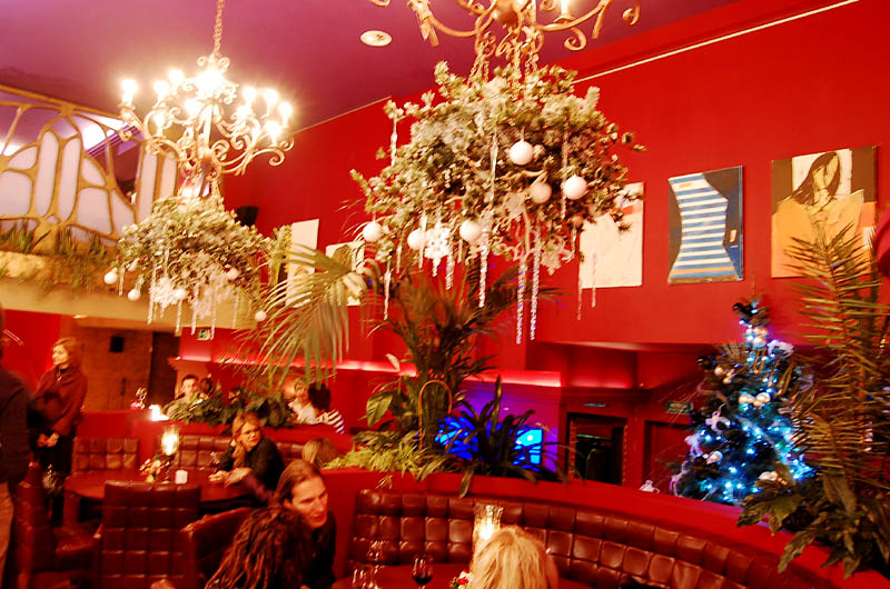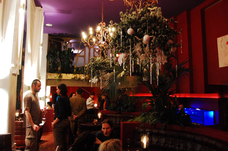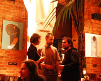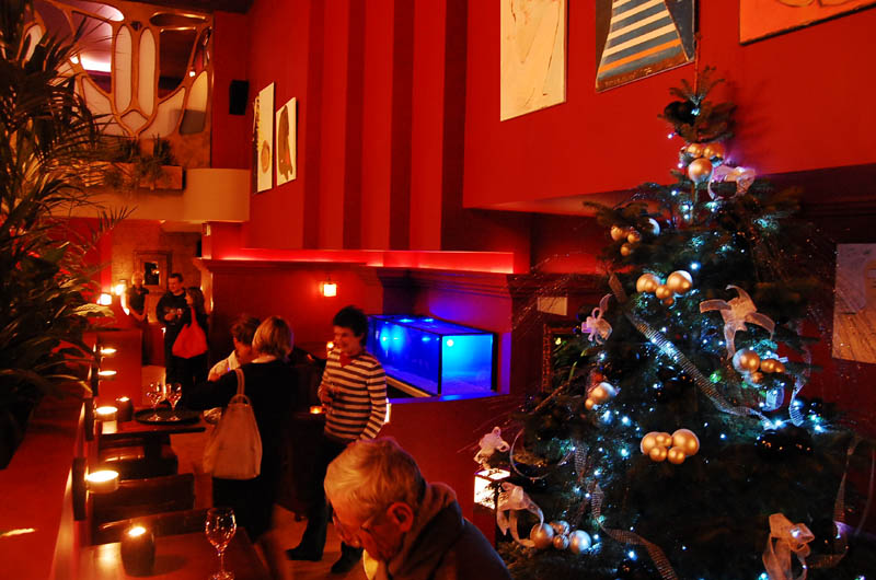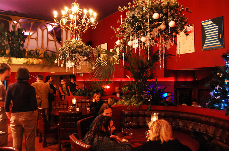 Klimat wnętrza lokalu nie nawiązuje do praskiego otoczenia, a przeciwnie - tworzy ekskluzywną oprawę, podkreśloną bogatą aranżacją, stawiającą na dekoracyjność i wygodę. Mimo takiego pomysłu na przestrzeń znalazło się tu odpowiednie miejsce na sztukę. Ogromna, pusta, pomalowana "muzealną" czerwienią ściana nad barem stanowi bardzo dobre passe-partout dla współczesnego malarstwa. To ona czyni 80 % przygotowanej wystawy, korespondując z niewielką ilością prac umieszczonych między filarami po przeciwnej stronie lokalu.