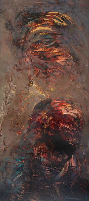 Święte czy nieświęte, ale od razu rodzi się pytanie, czy świętość i obraz to jedno i to samo, nie mówiąc o mniej czy bardziej wyczuwalnym poczuciu świętości człowieka 21 wieku i w ogóle, pomyślawszy o samym pojęciu świętości! Może już za szybko i za daleko pojechałem, ale obraz to przecież materia, tudzież materiał-towar podażny, sprzedażny, a o świętości myślimy spontanicznie, naturalnie, duchowo, że to coś, co jest niedotykalne, czego nie da się ubrać, uwyraźnić, zarysować, obłaskawić. A tu okazuje się, że niczego nie trzeba dotykać, obłaskawiać, bo i nie da się żadnej postaci świętej zauważyć! Świętych i nieświętych znamy wielu, portretowanych, ujmowanych, wyrażanych przez największych mistrzów sztuki w dziejach, ale oto w obrazach Maślankiewicza nie widzę żadnych świętych, ani pół, ani nawet ćwierć świętych. Nie ma żadnego adresu, nazwania, wszystkie obrazy są bez tytułu, mają numerację łacińską (I, II, III...XXIII....), ale formatowo wszystkie są pionowe, bez jakiejkolwiek figuracji, bez zarysów i obrysów pną się ku górze kolorem i światłem, na szczęcie bez jakiegokolwiek schematu geometrycznego, jakże chętnie konstruowanego przez wielu abstrakcjonistów, z (naiwną, nienaiwną) nadzieją, że to inteligentny przekaz dla innych planetarnych ludzików.