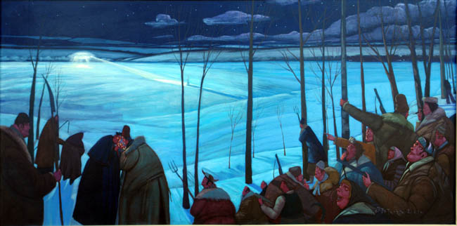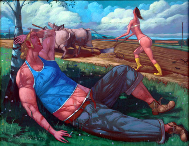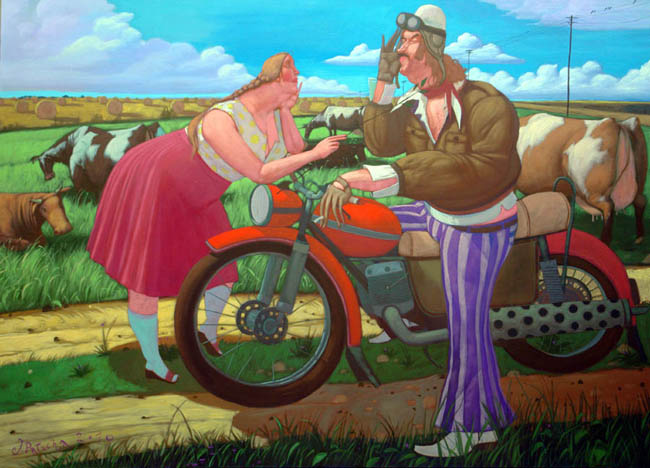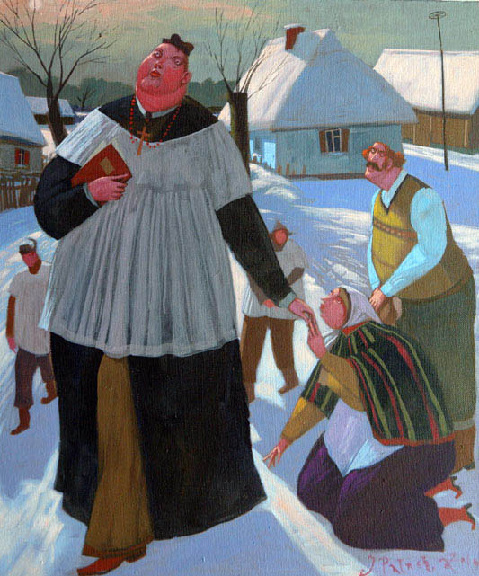 Szukamy więc zawzięcie w polsko - słowiańskich rytuałach, obrzędach, tradycjach, przekazach z przeszłości, choć zanurzeni jesteśmy we współczesną codzienność, w materialność indywidualnych bytów. Postaci z obrazów artysty są zarówno śmieszne jak i trochę dramatyczne. Są na swojej ludzkiej scenie przeskalowane bądź pomniejszone persyflażowo. Komedia łączy się w tym wyobrażeniowym teatrze kolorowych obrazów z tragedią. Mimo, że „lajtowo” można się pochichrać oglądając je, w końcu zauważamy po gogolowsku , iż śmiejemy się sami z siebie. Czasami łapiemy się również na tym, banalizując te przedstawienia malarskie, że to nas przecież nie dotyczy, że są trochę zbyt fantastyczne te wyobrażenia. Konstatację filozoficzną Gogola ciągle odrzucamy, choć stale jest przydatna. No cóż, najtrudniej jest poznać samego siebie, a o tym wiemy już od Sokratesa: jak jesteśmy pięknie zakłamani, jak wpadamy na swoje życiowe półprawdy, na zaminowane nimi nasze pole mentalno-duchowe.
