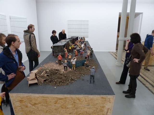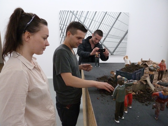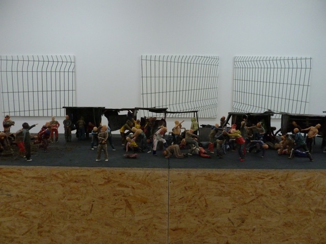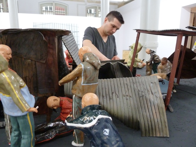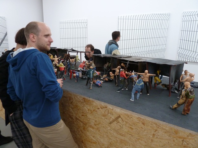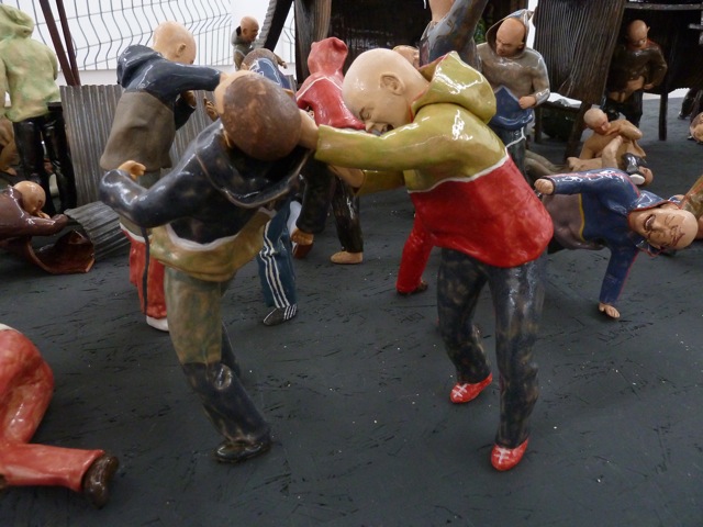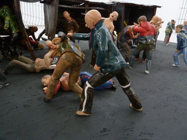 Tomasz Kulka wnikliwie obserwuje subkulturowe życie rodzinnego Wolbromia. Penetruje obszary zdewastowane, odnajduje ślady degradacji tkanki miejskiej. Na niedawnej wystawie w Centrum Rzeźby Polskiej w Orońsku pokazał grupową bijatykę - “ustawkę”. Kilkadziesiąt figurek z malowanej porcelany skłębiło się w brutalnej walce. Na obecnej wystawie Kulka rozbudowuje tę scenę dodając kolejne postaci, kolejne sytuacje. Przy czym każda postać ma indywidualne cechy a żaden gest, żaden moment nie powtarzają się. Obok, również wykonane z porcelany, przykłady owej zdegradowanej architektury: zabazgrane garaże, zdemolowany kiosk, połamany przystanek, odwzorowane w najdrobniejszych szczegółach. Patrząc na te obiekty, przyglądając się “ustawce”, widz czuje się jak Guliwer w kraju liliputów bez reszty pochłoniętych okrutną, bezlitosną walką.