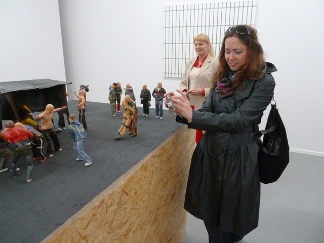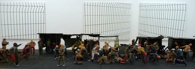 Wydaje się, że w grze w piłkę już dawno przestało chodzić o grę w piłkę. Wiadomości poza sportowe wypierają wyniki meczy. Nawet nie jest ważne kto z km grał. Liczą się ranni, aresztowani, zdemolowane samochody i witryny sklepowe. Futbol zamiast wyładowywać agresję wywołuje ją. Na stadionie nie murawa jest najważniejsza, ale solidne ogrodzenie. Galeria Propaganda przedstawia współczesne “sceny rodzajowe”.