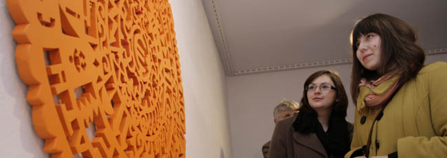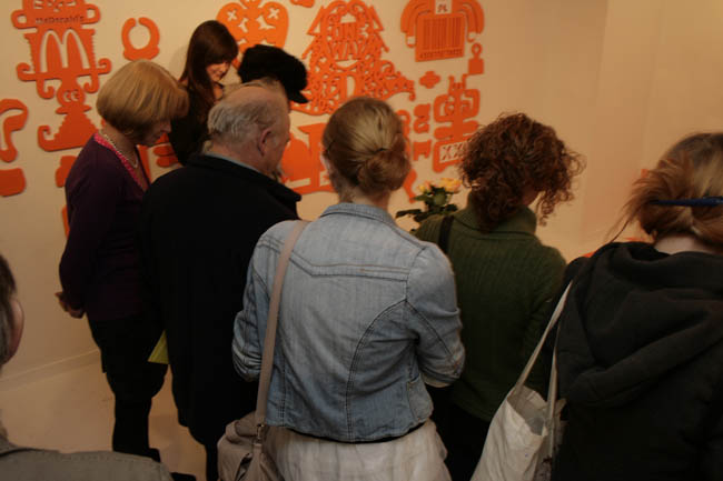 Białe pomieszczenie, wściekle pomarańczowe wlepki na podłodze i ścianie prezentujące znaki ostrzegawcze, które zostały przerobione przez artystę. Bawił się ich formą nadając im często śmieszne znaczenie. Zauważa, że znaki pozbawione oryginalnego kontekstu zatracają znaczenie. Interesuje mnie bardzo materiał, z którego wykonuję prace - folia samoprzylepna, przez którą prace stają się jednorazowe, bo nie można ich wykorzystać ponownie.