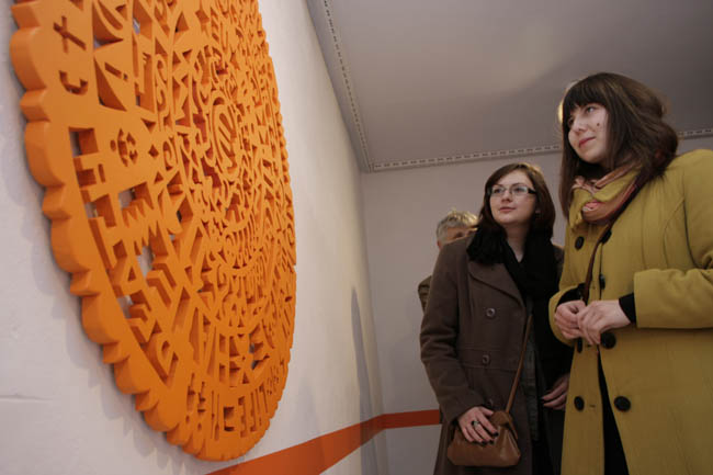 Moim marzeniem byłoby obklejenie całego pomieszczenia wlepkami. Na pewno wywołałoby to klaustrofobiczne wrażenie, jak z filmów - powiedział na wernisażu artysta Jakub Pieleszek - Próbowałem wpisać się w dostępną przestrzeń galerii.