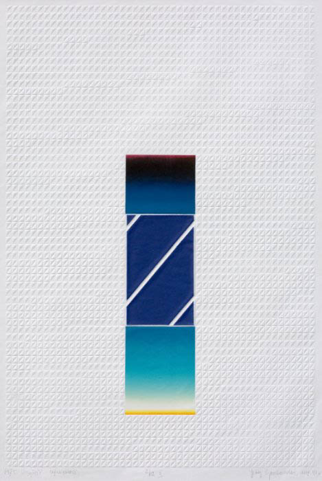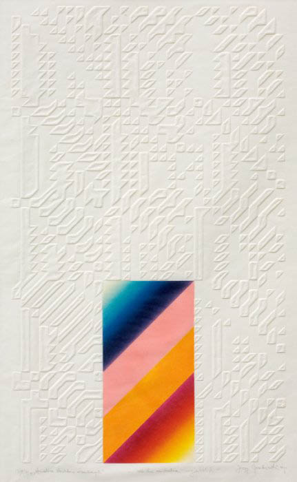 Misternie przygotowane matryce do suchego tłoku, matematycznie wyliczony rytm geometrycznych form tła zderzony z oszczędnym barwnym elementem daje niesłychanie mocną w sile wyrazu, absolutnie przekonywującą kompozycję.