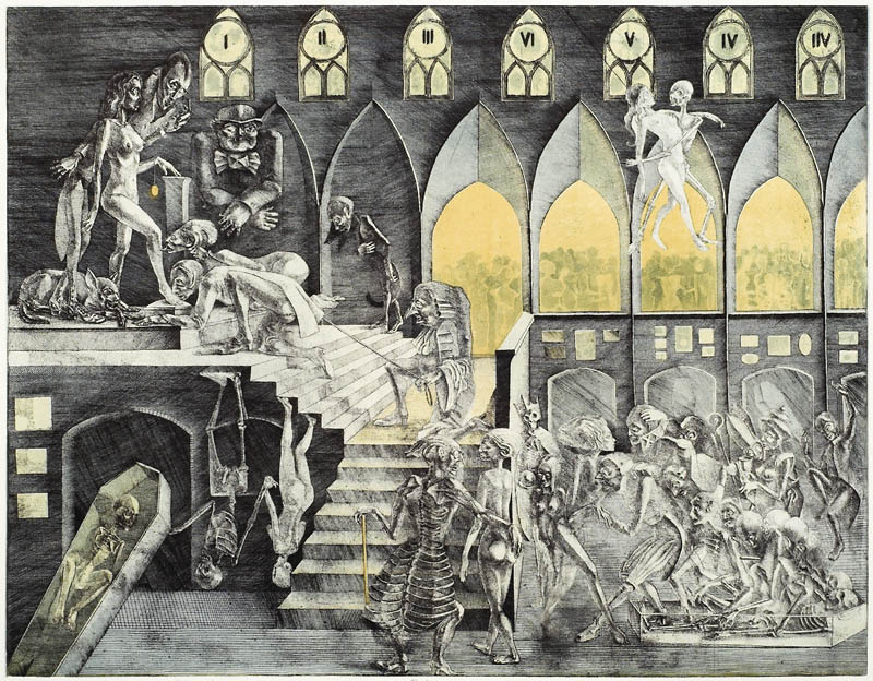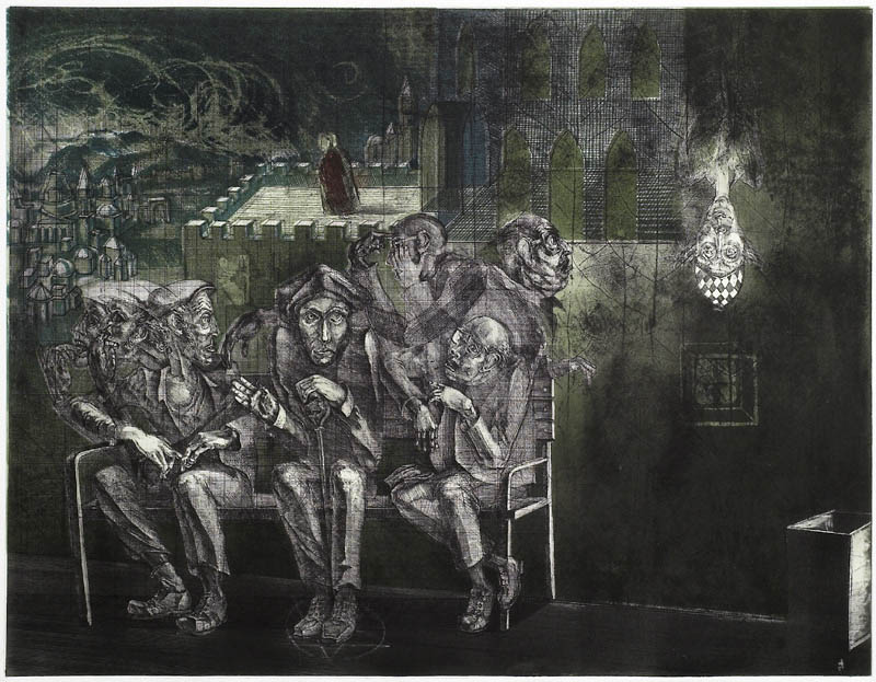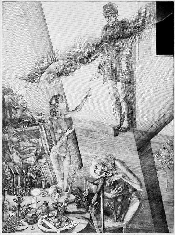 „Mistrz i Małgorzata” Michała Bułhakowa należy do arcydzieł literatury XX wieku. Przenikają się tam światy stalinowskiej Moskwy i chrystusowej Jerozolimy, a na tle tego wszystkiego obnażona zostaje kondycja ducha ludzkiego. Odwieczna walka dobra ze złem zmieszana z absurdem i satyrą niekoniecznie niesie optymistyczne przesłanie. Króluje zło, wszelkie wyższe uczucia o prawo swego bytu muszą toczyć nieustanny bój. Tak w świecie, jak i w każdym z nas. Te uniwersalne wartości powieści stały się punktem wyjścia dla Kacpra Bożyka. Wykonane przez niego grafiki, podobnie jak w powieści, „dzieją się” w różnych płaszczyznach. Niezwykle precyzyjne, operują aż do przesady misternym szczegółem, ujmując jednocześnie w sposób syntetyczny główne problemy moralne, znane już z powieści. Celność wyrazu wyłania główną anegdotę i symbolikę przedstawień z pozornego chaosu. Pojawiają się oczywiście czarne koty (Behemoty zapewne), ale też przedmioty, które zgodnie z barokową tradycją, symbolizują kruchość życia, ulotność i zmienność losu. Rozrzucone karty do gry, płonące świece, czaszki i ludzkie szkielety to swoiste memento mori we współczesnym wydaniu. Ta precyzja przedstawień i misterność oddania szczegółu nasuwa oczywiste skojarzenia z holenderskim malarstwem rodzajowym XVII wieku. Podobny bogaty zestaw rekwizytów, z których każdy jest rebusem, kryjącym najczęściej moralne przesłania. Idąc tą droga możemy sięgnąć w jeszcze bardziej odległe czasy, do Dürera, i skojarzyć jego graficzne przedstawienia Czterech Jeźdźców z jeźdźcami niesionymi na grzbiecie szkieletu konia w jednej Wielowątkowość grafik Bożka.