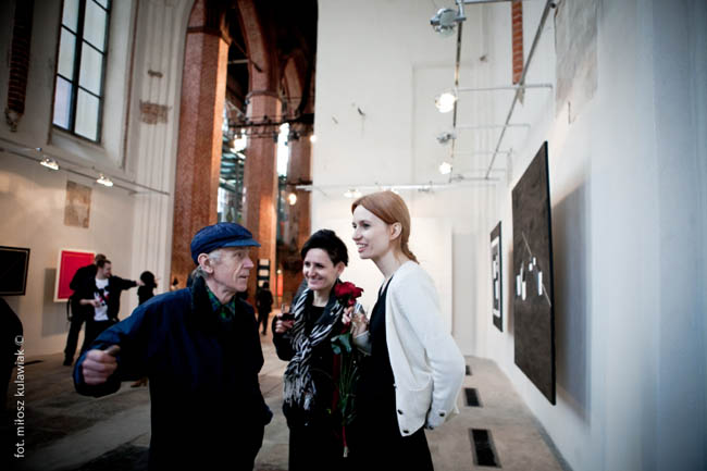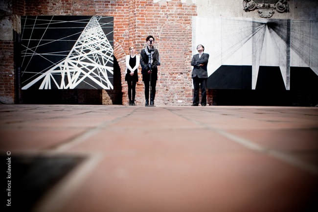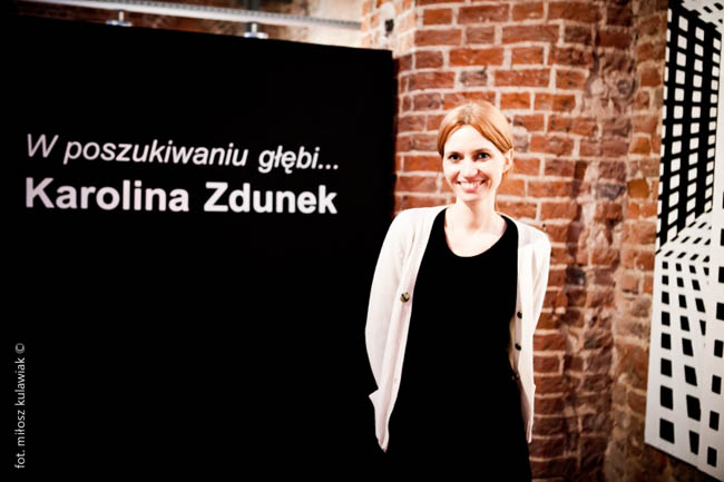 Mając na uwadze dotychczasowe wystawy tej artystki, chyba po raz pierwszy jej ogromne prace (m.in. zaprezentowane tutaj tryptyki, których długość dochodzi prawie do 6. metrów) znalazły się w przestrzeni równie imponującej pod względem skali, jak one same. W przestrzeni o tyle wyjątkowej, bowiem w architekturze dawnego kościoła gotyckiego. Poprzez obecność w przestrzeni naznaczonej duchem sacrum zobrazowane przez Karolinę – za pomocą najprostszych form geometrycznych, rozrysowanych siatek perspektywicznych i oszczędnej gamy kolorystycznej – wyobrażenia podjętych przez nią pojęć (np. studni, głębi, bloków) jeszcze wyraźniej nabrały cech zawartych w nich, pierwotnych symboli. Pomiędzy danym miejscem, a płótnami, które się w nim znalazły, niespodziewanie nakreśliły się interesujące (można nawet pokusić się o sformułowanie – „na wyższym poziomie”) relacje. Potężna Studnia (tryptyk, 2010), zwyczajnie oparta o ścianę prezbiterium, osadzona w miejscu dawnego ołtarza, bezpośrednio na posadzce pokrytej płytami nagrobnymi, jawi się jak „wyrastające z podłoża”, rozświetlone wpadającym przez wertykalne okna prezbiterium światłem – co może wskazywać na pierwotne źródło samo w sobie i zarazem potężny i solidny fundament – symboliczny początek. Tryptyk ten, od razu widoczny nawet z bardzo daleka, bo zaledwie po przekroczeniu drzwi do głównej nawy EL, staje się mocnym i znaczącym punktem ciężkości całej wystawy i zarazem też metafizycznym celem podjętej przez nas wędrówki. To nie jedyny przykład pojawiąjących się lokacyjno-aranżacyjnych interakcji płócien Karoliny Zdunek wobec – jednak ciągle nietypowej, jak na przestrzeń muzealno-wystawienniczą – architektury CS Galerii EL; interakcji przenoszących (i przekraczających) percepcję tego malarstwa ze sfery (tylko) sensualno-obrazowej dodatkowo w obszar duchowo-egzystencjalny. Podobnych zabiegów jest więcej, warto samemu je zgłębić.