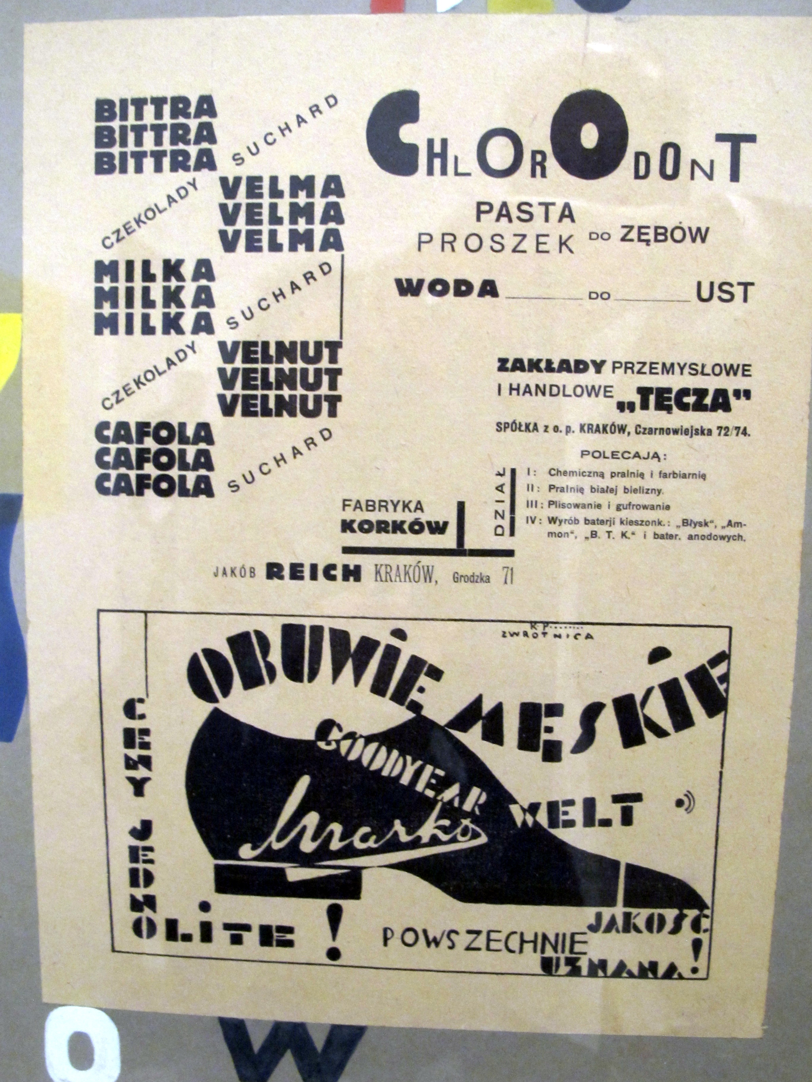 W porozstawianych gablotach umieszczono szereg zdjęc, rysunków i interesujących publikacji sprzed prawie stu lat opracowanych przez Strzemińskiego: projekty okładek do pisma Zwrotnica z 1923 roku, do zbioru poezji Juliana Przybosia z 1926 i do tomiku W głąb las z 1932. Jest też egzemplarz Jana Brzękowskiego Zacisnięte dookoła ust z 1936 roku i praca zbiorowa O sztuce nowoczesnej wydanej w 1934 przez Wyd. Tow. Bibliofilów w Łodzi.