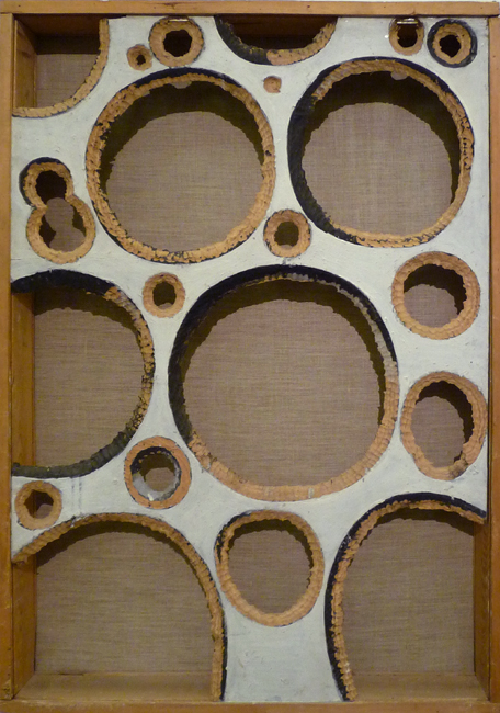 Są to realizacje młodego wówczas artysty, dla którego praca twórcza była oderwaniem od doświadczenia trudnej rzeczywistości. Artysta wypowiadając się poprzez obraz wykracza poza dwuwymiarową płaszczyznę ku przestrzeni. Kamoji wprowadza odpowiedni porządek, z ogromną dbałością wybiera materiał, z którego tworzy lapidarne, syntetyczne w formie kompozycje. Realizuje naścienne reliefy oparte na prostych geometrycznych układach, a ich wizualne dopełnienie, rekonstrukcję w przestrzeni odnajdujemy w umiejscowionej centralnie, na podłodze, rzeźbie zatytułowanej Tęcza (1967). W eksponowanych wewnątrz sali wystawienniczej pracach artysta stopniowo redukuje lica obrazów poprzez wydrążanie, powielanie i zwiększanie otworów o homeomorficznych kształtach. W efekcie uzyskuje obrazy-reliefy ze zróżnicowanym natężeniem fakturowym, z ograniczoną kolorystyką do czerni i bieli.