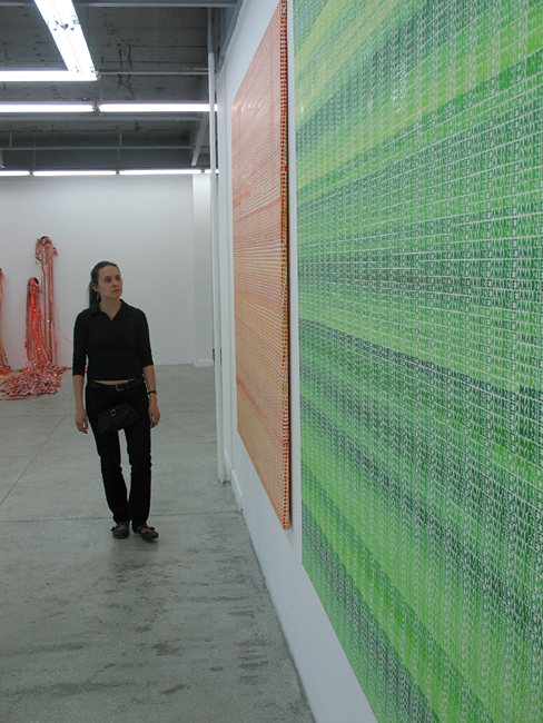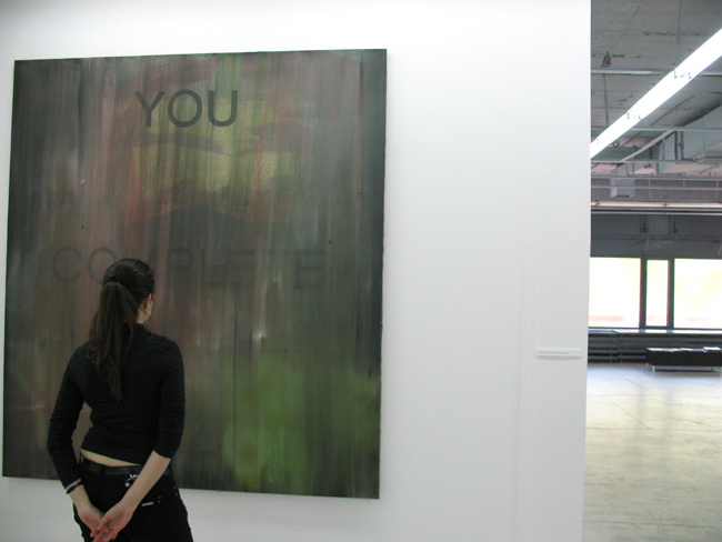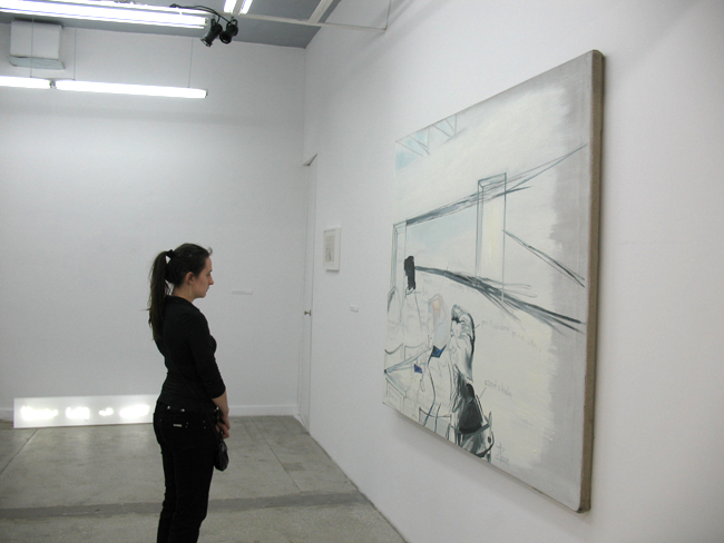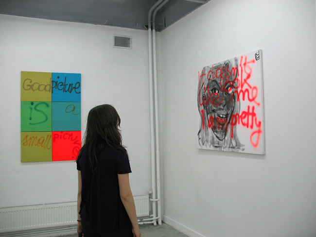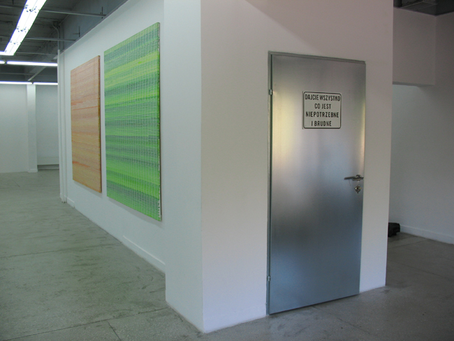 Wystawę otwierają prace nestora polskich malarzy piszących – Pawła Susida. Jego, jak zawsze, intelektualne i refleksyjne płótna, to mocny punkt ekspozycji, podobnie jak instalacja Jadwigi Sawickiej. Praca artystki od razu „wpada w oko”, a to za przyczyną, kolorowych, migoczących lampek, które przeplatają się z charakterystyczną różowo-cielistą taśmą, na której wypisane zostały powtarzające się hasła: „dojrzała, zmysłowa, nasycona” i „podatna, mięsista, gruba”. Tymi słowami opisuje Sawicka „Materię malarską”, jak stanowi tytuł tej instalacji. Zgoła niemalarskie są prace Ciecierskiego – to seria rysunków nowych oraz z wcześniejszych lat. Tautologiczny zabiegieg zastosowany przez autora, w którym napisanym słowom odpowiadają ich obrazkowe równoważniki, porusza kwestię znaczenia i jego reprezentacji. Z kolei Kuskowski malując powiększone grzbiety książek z zakresu historii sztuki dokonuje identyfikacji przedmiotu z malarstwem, jednocześnie ją demaskując.