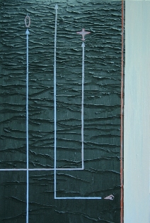 Świat malarski Marka Zająca to statki, samoloty, maszyny. To fascynacja techniką. Na płaskim tle maluje strzałki, okręty, łodzie podwodne.