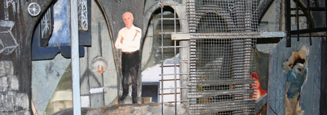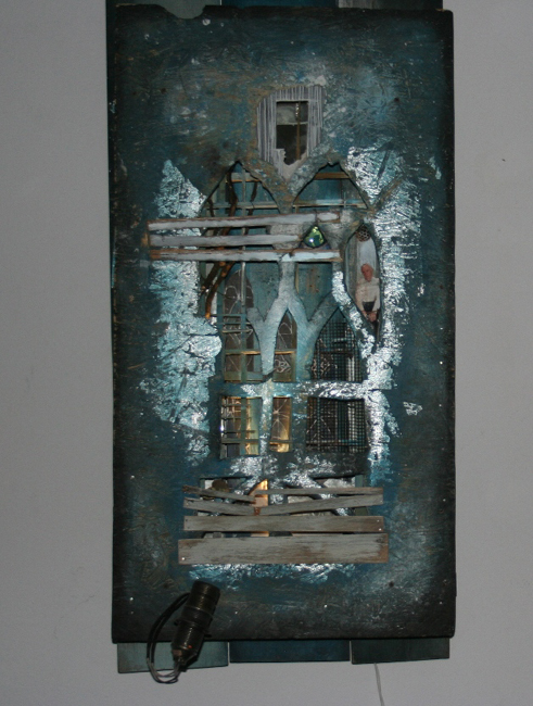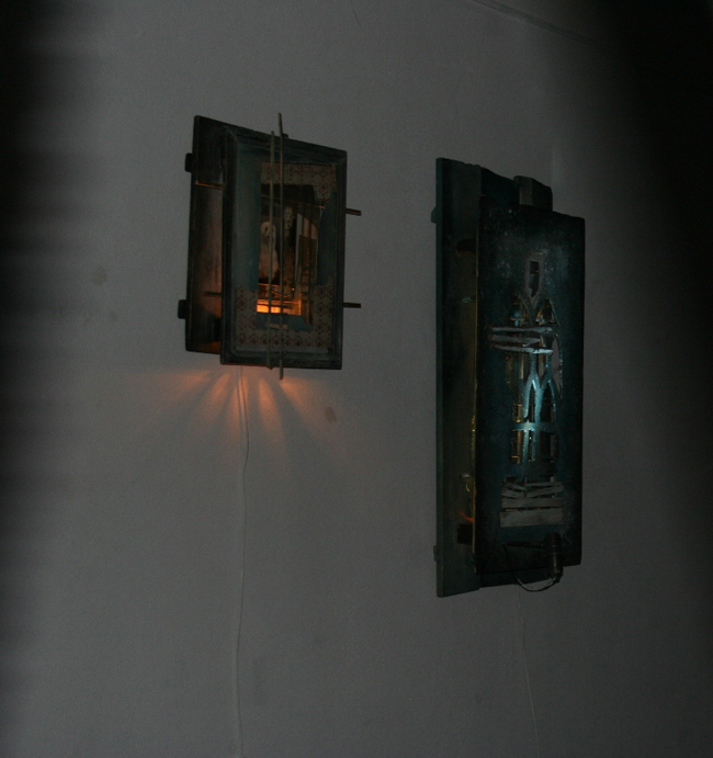 W wejściu zawieszone zostały płachty grubego , czarnego materiały. Za nimi w głębi pomieszczeń rozwija się dziwny świat Michała Mackiewicza. W pierwszym pokoju są to rzeźby – obiekty dizajnerskie, mogłyby nadawać się do wnętrza współczesnej kawiarni. Są nostalgiczne, nadgryzione zębem czasu. Przypominają stary, zapomniany mebel lub pomiętoszony obrazek w potłuczonej ramce. Są wykonane z bardzo wielu elementów – zdjęcie psa, kawałek deseczki, drucik, motyw gotyckiego okna zrobiony z kartonu. Wszystko ma wymiary niedużego obrazka. Podświetlenie z dołu wzmaga wrażenie nastrojowości, nostalgii, a nawet mroczności.