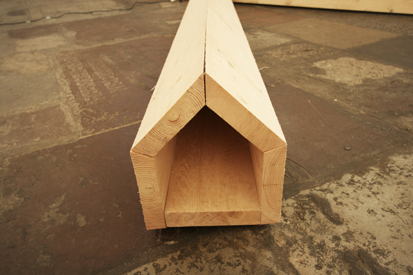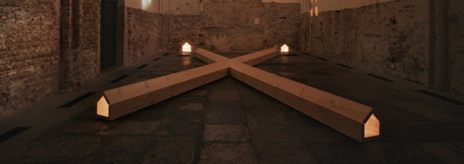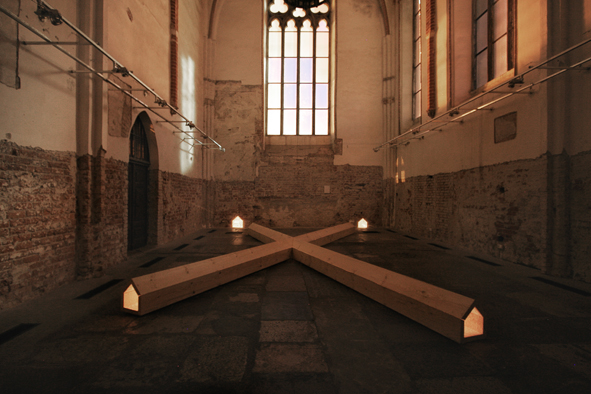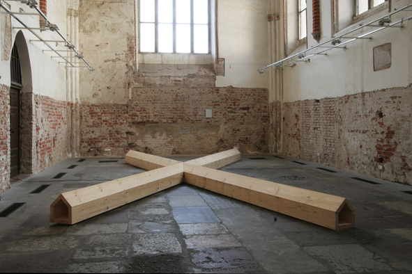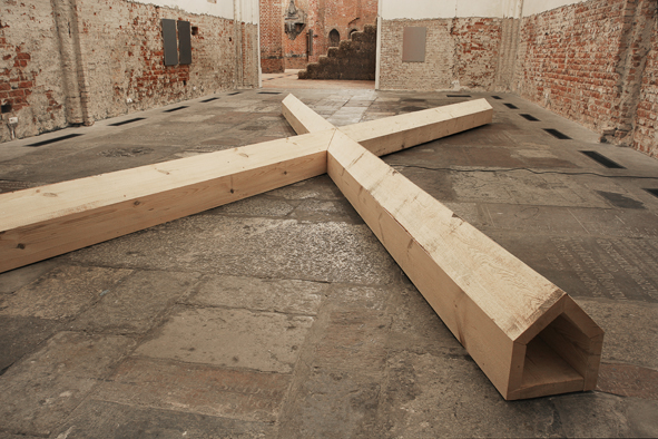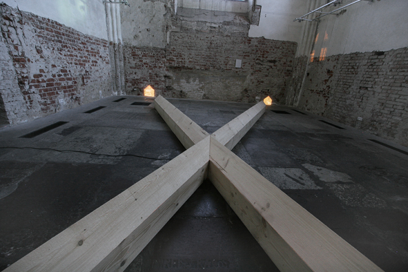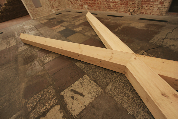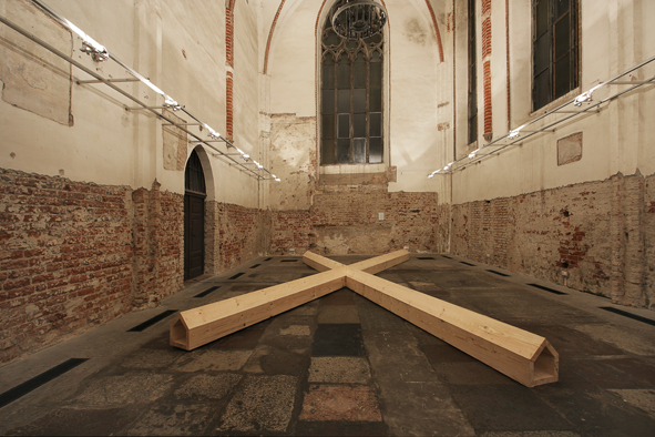 Drewniany krzyż tworzony z form przypominających w przekroju dom ulega deformacji do znaku X. Jest zapisem symbolicznego trwania byłej przestrzeni sakralnej, "przekreślonej" właśnie znakiem X. Angelov stawia tym samym pytanie o trwałość tożsamości Galerii EL, jego praca jest apelem o pamięć miejsca, akcentowanym umieszczeniem we wnętrzu - na przecięciu ramion krzyża policyjnego "koguta".