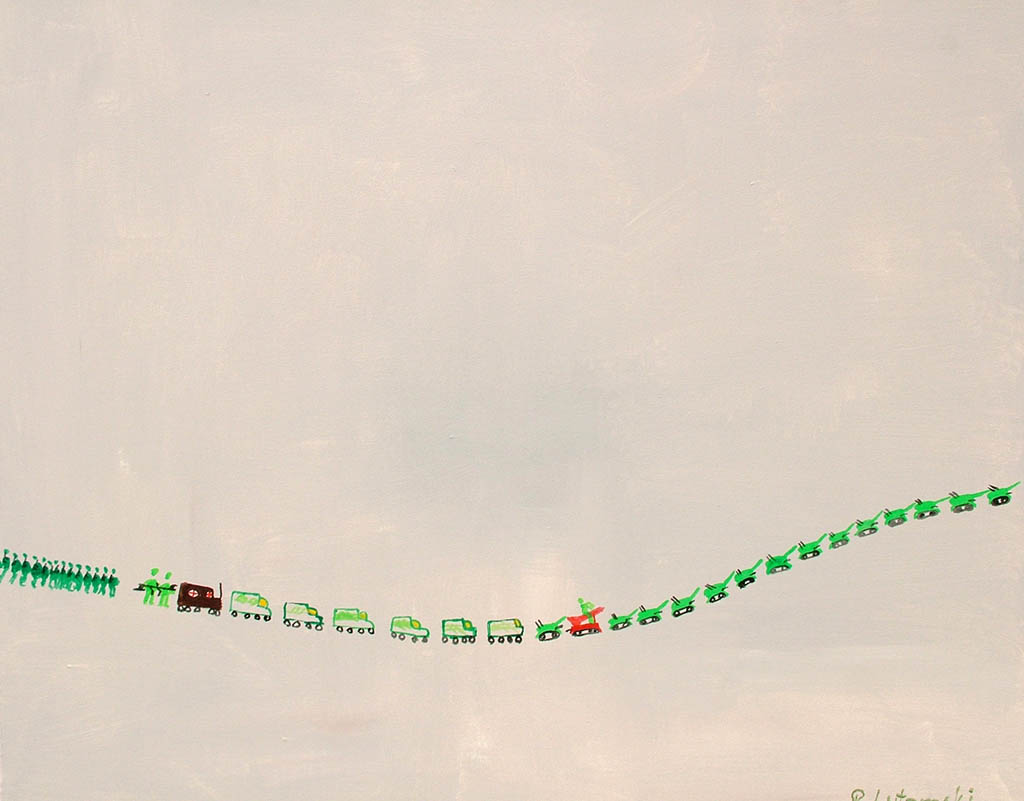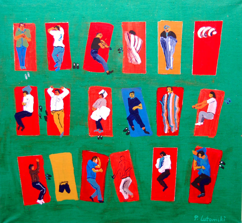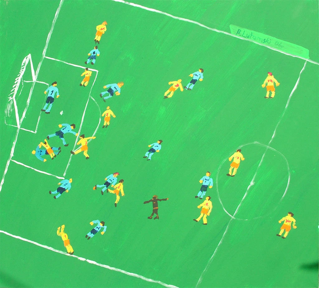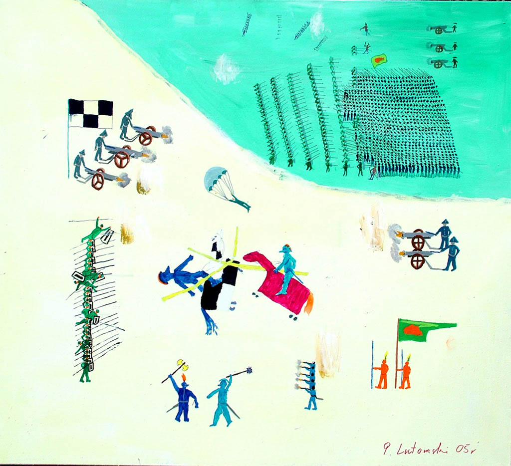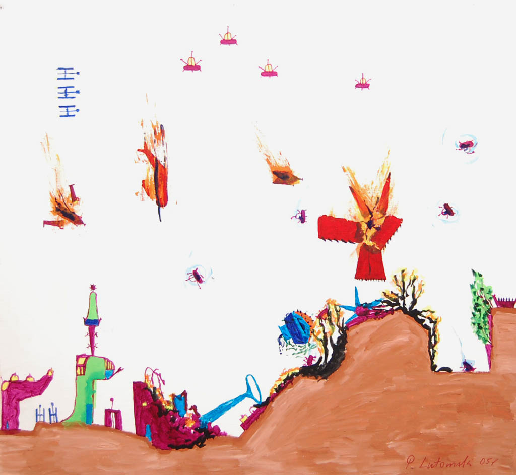 Często na wystawach sztuki współczesnej słyszy się komentarz płynący z ust co bardziej konserwatywnej części publiczności - "Moje dziecko też tak potrafili..." To spora odwaga malować w sposób nieodparcie kojarzący się z twórczością dzieci. Patryk Lutomski przede wszystkim jest grafikiem, laureatem licznych nagród w tej dziedzinie, asystentem na Wydziale Grafiki krakowskiej ASP. Malarstwem zajmował się zawsze, ale był to uboczny nurt twórczości, właściwie nie pokazywanej na wystawach. Inspiracje w dziecięcych bazgrołach odnalazł trzy lata temu, kiedy sprzątając pracownię natrafił na "szkicownik" pięciolatka własnego autorstwa. To on natchnął go sposobem malowania, ale także tematyką. To co Lutomski robi, to poważne malarstwo, ale przyznaje, że często w trakcie malowania świetnie się bawi np. wtedy, kiedy obraz jest zapisem jakiejś gry, którą autor realnie prowadzi na płótnie, wcielając się w role kolejnych graczy.