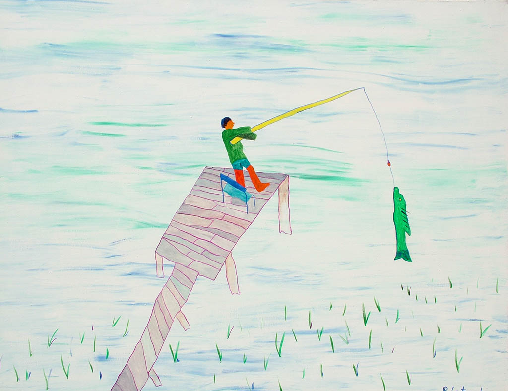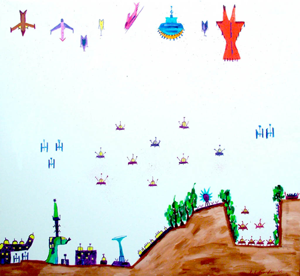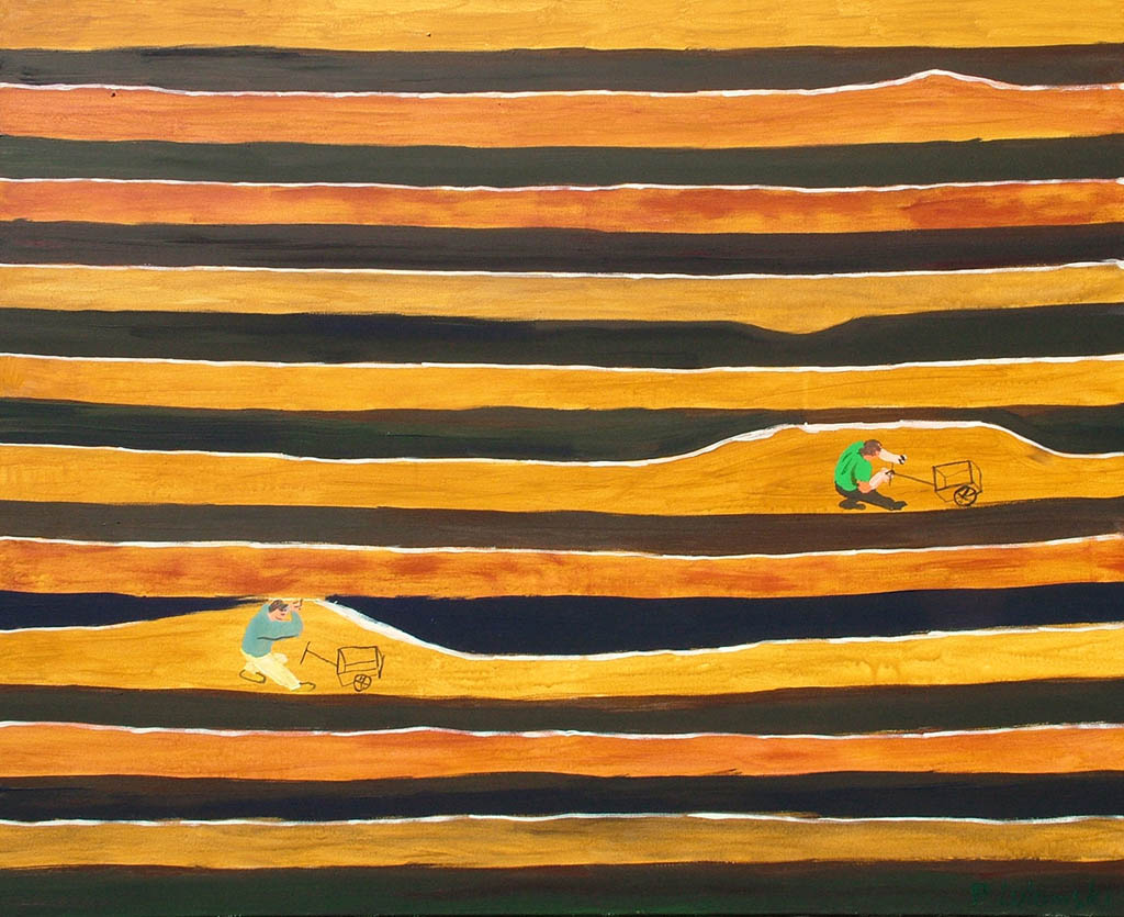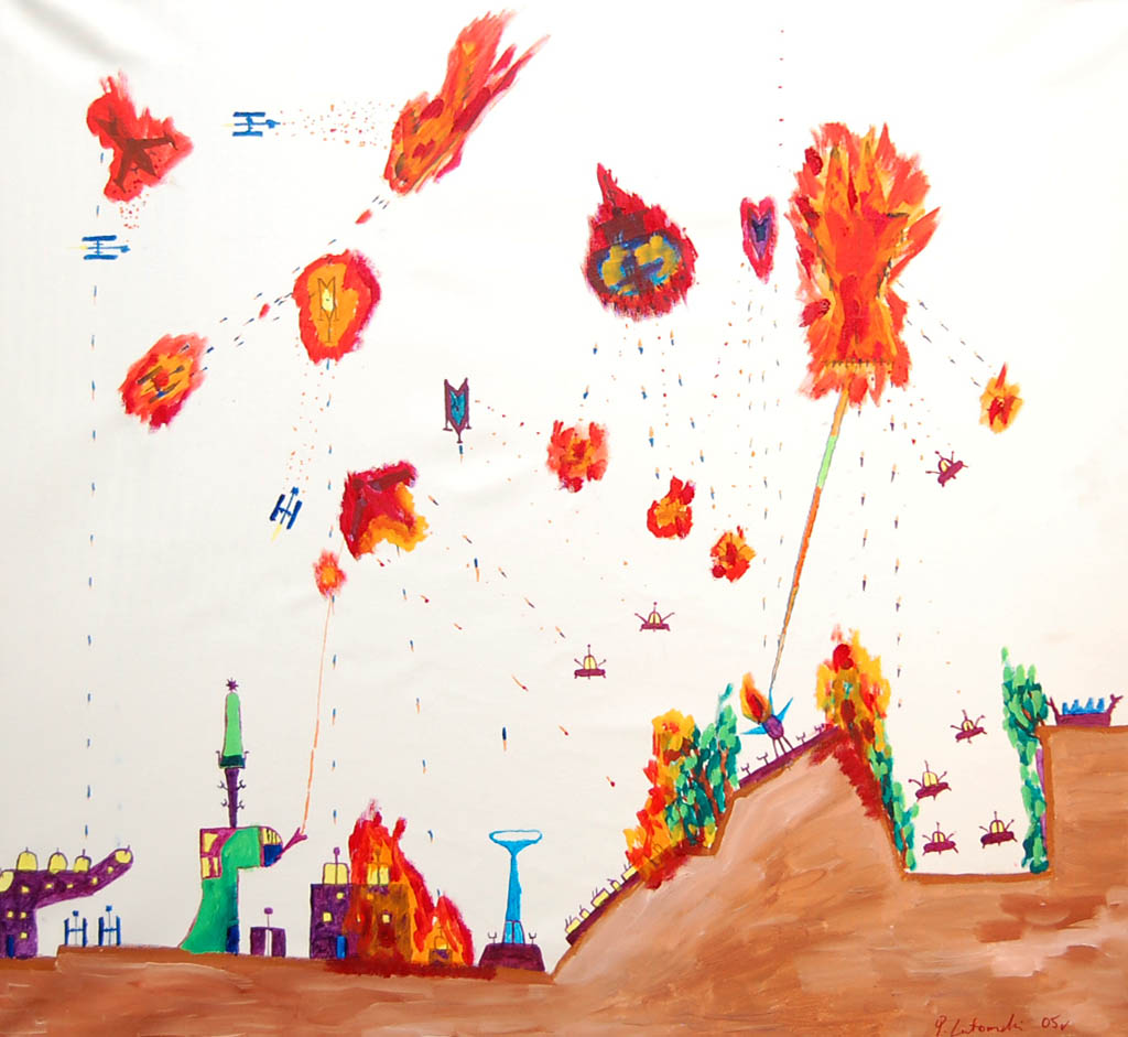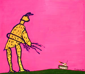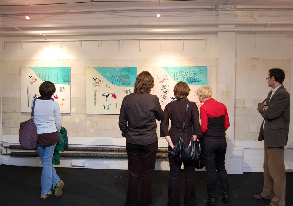Często na wystawach sztuki współczesnej słyszy się komentarz płynący z ust co bardziej konserwatywnej części publiczności - "Moje dziecko też tak potrafili..." To spora odwaga malować w sposób nieodparcie kojarzący się z twórczością dzieci. Patryk Lutomski przede wszystkim jest grafikiem, laureatem licznych nagród w tej dziedzinie, asystentem na Wydziale Grafiki krakowskiej ASP. Malarstwem zajmował się zawsze, ale był to uboczny nurt twórczości, właściwie nie pokazywanej na wystawach. Inspiracje w dziecięcych bazgrołach odnalazł trzy lata temu, kiedy sprzątając pracownię natrafił na "szkicownik" pięciolatka własnego autorstwa. To on natchnął go sposobem malowania, ale także tematyką. To co Lutomski robi, to poważne malarstwo, ale przyznaje, że często w trakcie malowania świetnie się bawi np. wtedy, kiedy obraz jest zapisem jakiejś gry, którą autor realnie prowadzi na płótnie, wcielając się w role kolejnych graczy.
