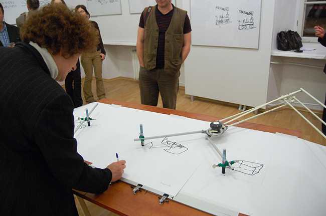 Paweł Kwiek zbudował maszynę do rysowania. Jest to maszyna szczególna. Dwie osoby podchodzą do jakby kreślarskiego stołu. Jedna bierze flamaster i rysuje cokolwiek, druga osoba innym flamastrem także wykonuje rysunek wg własnej fantazji. Między dwoma osobami jest trzecia kartka i trzeci flamaster, który w machinie tworzy wypadkową dwóch rysunków, w ten sposób powstaje międzyrysunek. Drugą technikę opisuje sytuacja "(...) rysujący pisak porusza papierem, na którym rysuje drugi rysownik. Jego z kolei pisak porusza kartką pierwszego. Obydwaj rysują na wzajemnie poruszanych kartkach - powstają od razu dwa międzyrysunki".