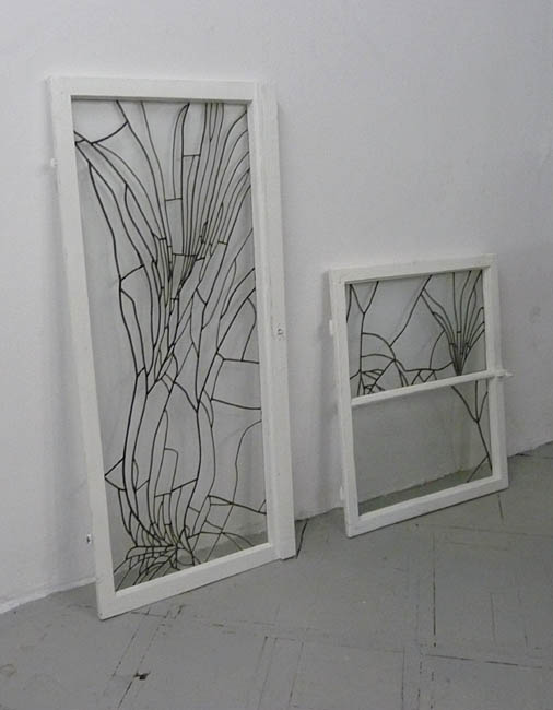 Czerń pojawia się w Witrażach, odrębnych pracach, które na zasadzie repetycji powielają załamania rozbitej szyby. Zamknięte wewnątrz ram okiennych, tworzą kompozycje złożone z kawałków szkła łączonych czarnymi, ołowianymi ramami, wiernie odwzorowując siatkę pęknięć.