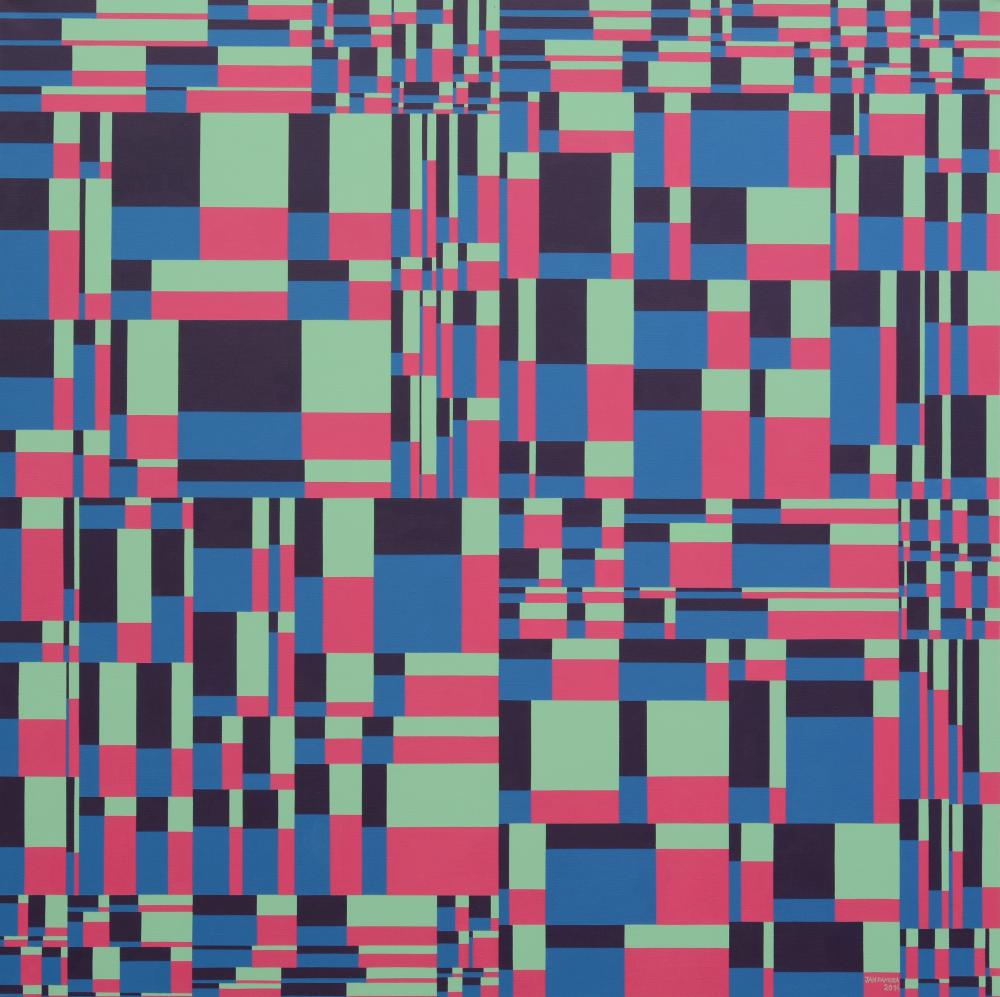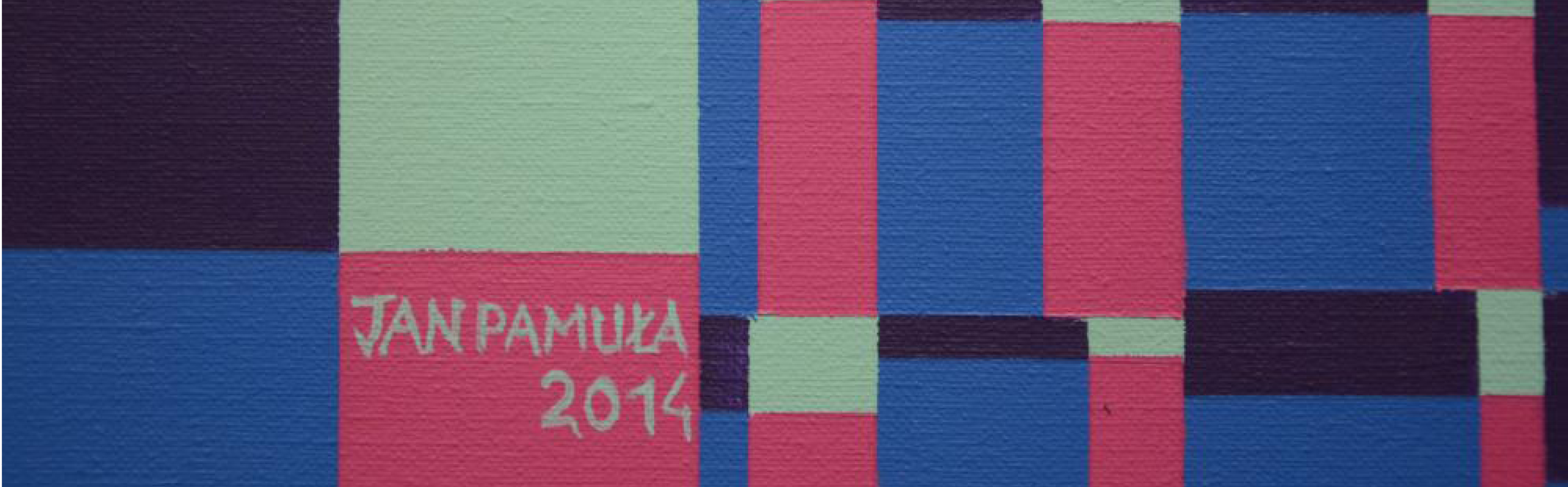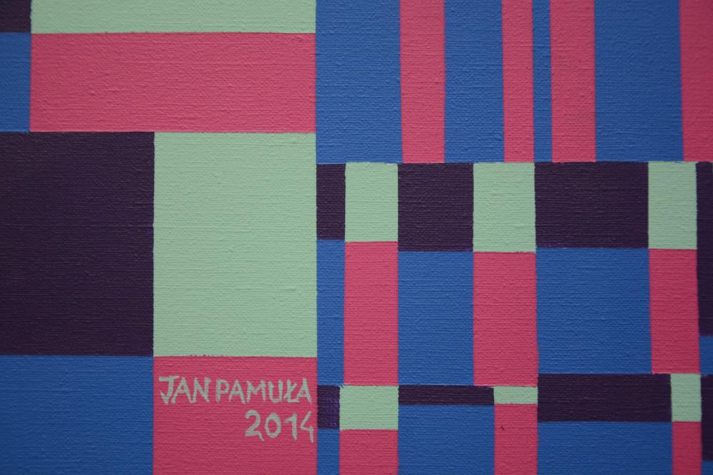 Prezentowane płótna Jana Pamuły wypełnione są szczelnie setkami prostokątów o różnych wymiarach. Na jednym płótnie nie znajdziemy dwóch takich samych obiektów. W każdej pracy użyty jest zestaw czterech starannie dobranych barw. Płótna artysty cechuje dbałość o każdy najmniejszy szczegół. Migotliwość elementów wprowadza przestrzenność kompozycji. Obrazy artysty stanowią odrębne wizualne struktury. Malarz dąży, aby przyjęty przez niego system kształtowania abstrakcyjnych form był odzwierciedleniem uniwersalnych prawd. Warto wspomnieć, że Jan Pamuła jest jednym z pierwszych polskich artystów, którzy wykorzystywali komputer jako szkicownik.