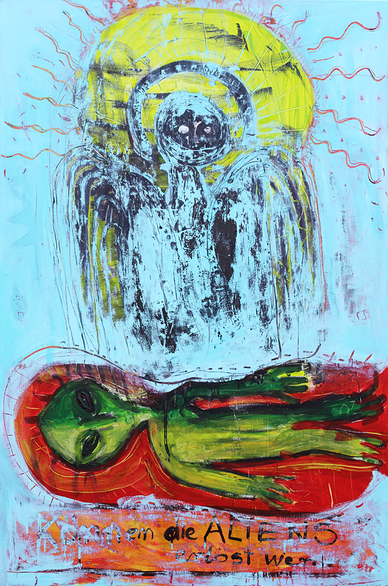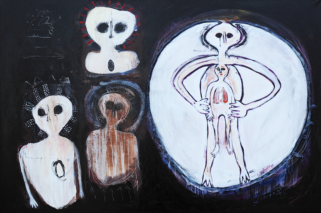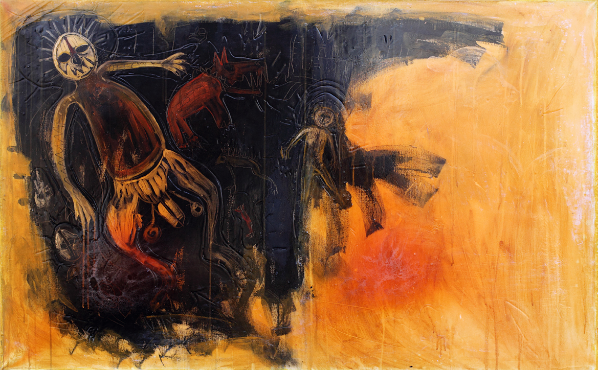 Ludzkość uznawała dotąd tylko ekskluzywne światy sztuki, jak ekskluzywne są religie; nasza sztuka jest Olimpem, gdzie wszyscy bogowie, wszystkie cywilizacje zwracają się do wszystkich ludzi, którzy rozumieją język sztuki (jak nauka zwraca się do wszystkich rozumiejących jej język...) Każda cywilizacja miała swoje święte miejsca; teraz ludzkość odkrywa swoje. (…) Wszystko to łączy się z sobą po raz pierwszy w świecie, gdzie umierające fetysze zyskują życie, jakiego nigdy nie znały; i ten świat przedstawień, który ludzka twórczość przeciwstawiała czasowi, po raz pierwszy odniósł zwycięstwo nad czasem.1 Ten wielobarwny świat wierzeń, mitów i legend ożywa za sprawą malarstwa Piotra Ambroziaka. Czas i miejsce nie mają tu znaczenia, najważniejszy jest pierwiastek stanowiący o naszym człowieczeństwie, duchowość przekazywana niczym życiodajna iskra. Obrazy jak nakładające się klisze podświadomości przywołują nasze demony oraz pragnienia łączności ze Stwórcą, zapełnienia tajemniczej pustki i samotności tu na ziemi. Aniołowie i kosmici, pozaziemskie byty, posłańcy łączący to co rzeczywiste i nadprzyrodzone. Dr Michael Rappenglueck w pokrywających groty Lascaux wyobrażeniach zwierząt i scen polowań dostrzegł obraz nieba sprzed bez mała 17 tys. lat. Nasi przodkowie też zwracali oczy ku niebu, które dla nich zamieszkane było przez zwierzęta i duchy-przewodników. To pierwsze znane nam planetarium, świadectwo tęsknoty za tym co mistyczne, do końca nieodgadnione. Dla współczesnej cywilizacji mieszkańcy kosmosu to przeobrażone mityczne siły, religia obleczona w szaty nowoczesności, cywilizacyjna legenda.