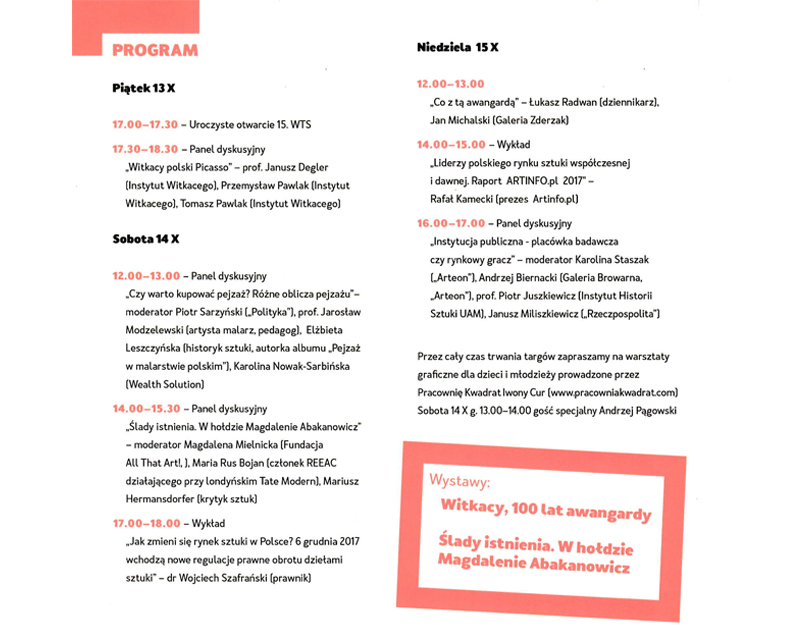 Mogliśmy uczestniczyć w wykładach, panelach i dyskusjach, podczas których odnoszono się do ważkich spraw dla rynku sztuki - tak jak podczas spotkania z doktorem Wojciechem Szafrańskim, na temat nowych regulacji prawnych w obrocie dziełami sztuki. Wyjątkowe emocje budził Raport ARTINFO.pl 2017 - Liderzy polskiego rynku sztuki współczesnej i dawnej, przedstawiony przez - także lidera informacji aukcyjnych - Rafała Kameckiego (prezes Artinfo.pl).