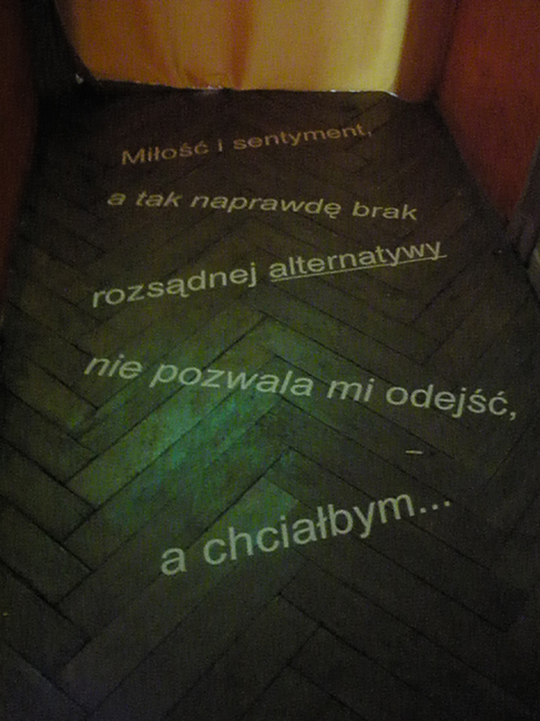 Wystawa The best of Piksel została jak zwykle zaaranżowana w ten sposób, że zajmuje całe mieszkanie – pracownię w zabytkowej kamienicy. Ciemnym korytarzem dochodzimy do kotary z projekcją video – przedstawiającą balkon, która zaprasza do środka ekspozycji. Na podłodze poezja Gromka „Miłość i sentyment, a tak naprawdę brak rozsądnej alternatywy, nie pozwala mi odejść – a chciałbym”. Osobiste wyznanie witające gości wystawy stanowi zapowiedź jej tematu. Panowie z Piksla tym razem zajęli się problemem damsko-męskim.