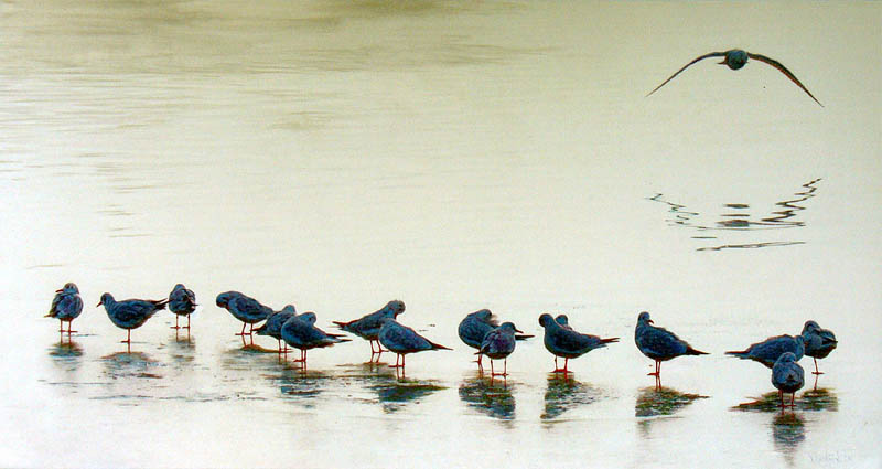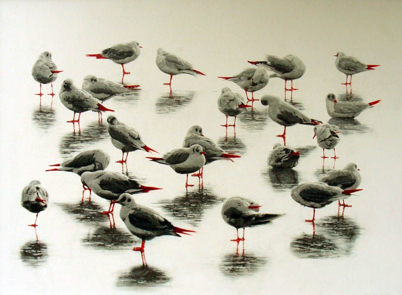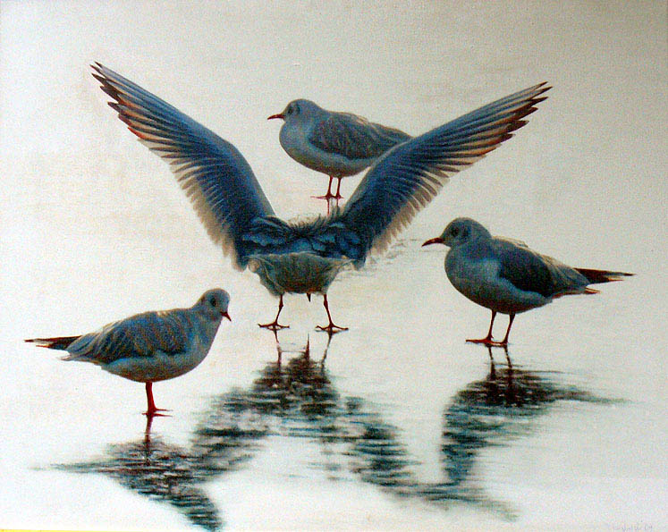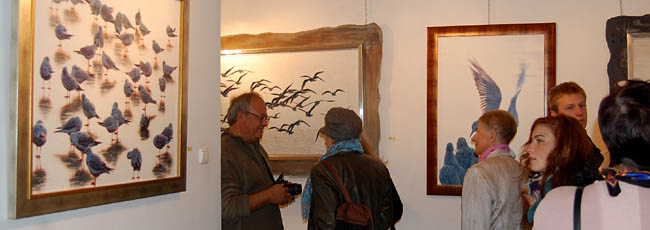 Na ekspozycji można zobaczyć obrazy przedstawiające ptaki i martwe natury. Z daleka, prace wyglądają jak fotografie, dopiero z bliska widać, że jest to unikatowa technika pasteli, gdzie każdy kolor nakładany jest osobno warstwami, a użycie pary wodnej daje efekt końcowy czyli precyzyjny trójwymiarowy rysunek. Martwe natury przedstawiają rośliny w szklanych wazonach na czerwonym tle. Wszystkie elementy obrazu migoczą światłem. Jest coś niesamowitego w technice Cieplińskiego, oprócz zagadkowego efektu, mamy do czynienia z mistrzostwem warsztatu. Całkiem inne w odbiorze są obrazy przedstawiające ptaki, głównie gołębie i mewy. W kolorze monochromatycznym, w szarościach, na białym tle. Ptaki namalowane są z anatomiczną dokładnością. Najpiękniejsze są te, które zrywają się do lotu, czuje się w nich siłę i delikatność zarazem.