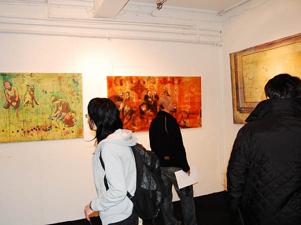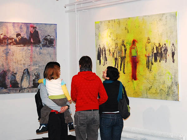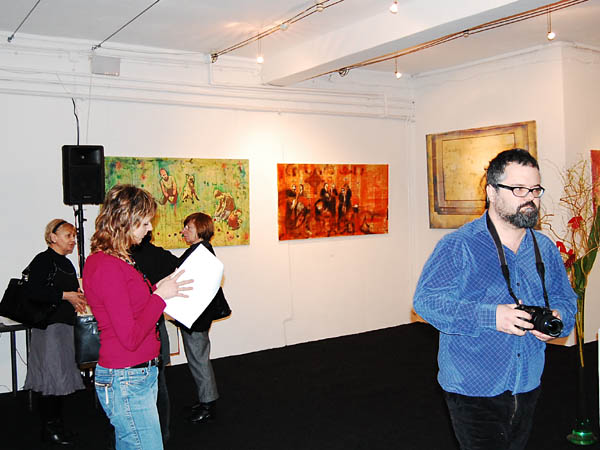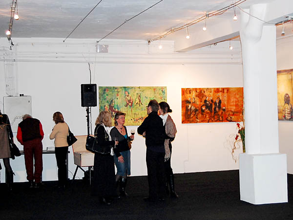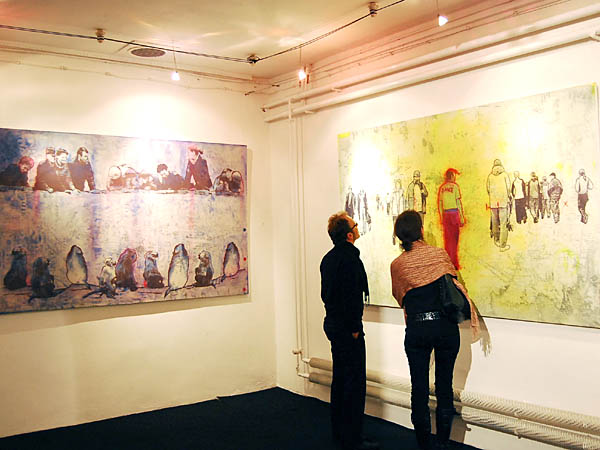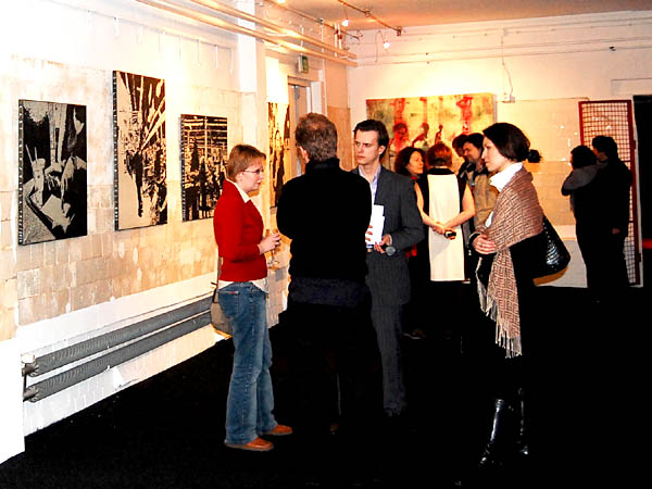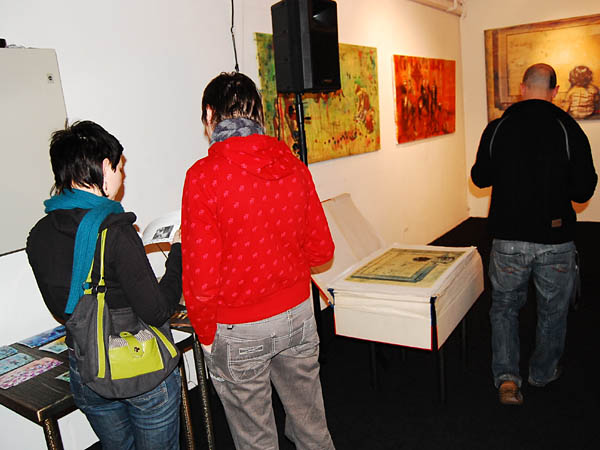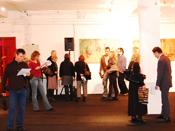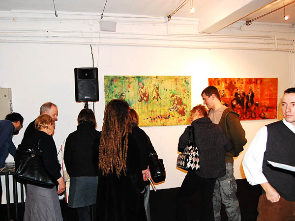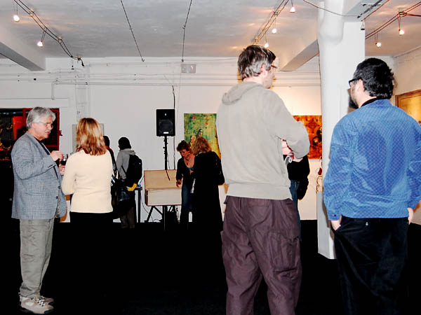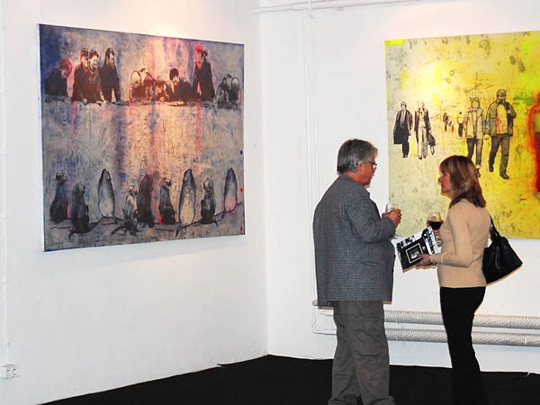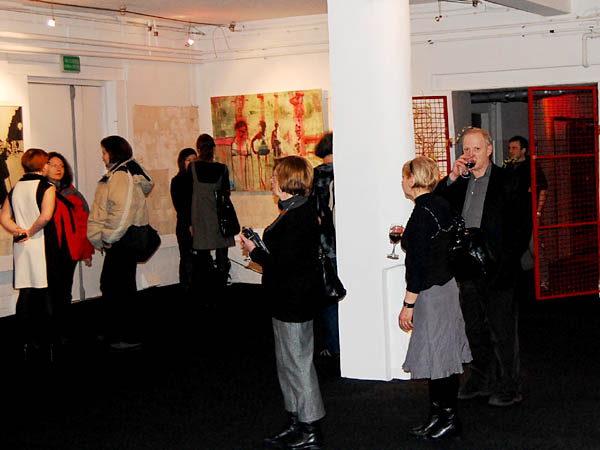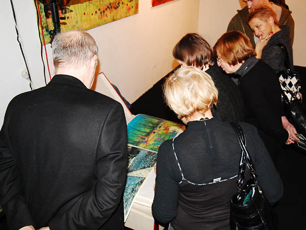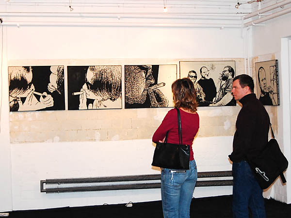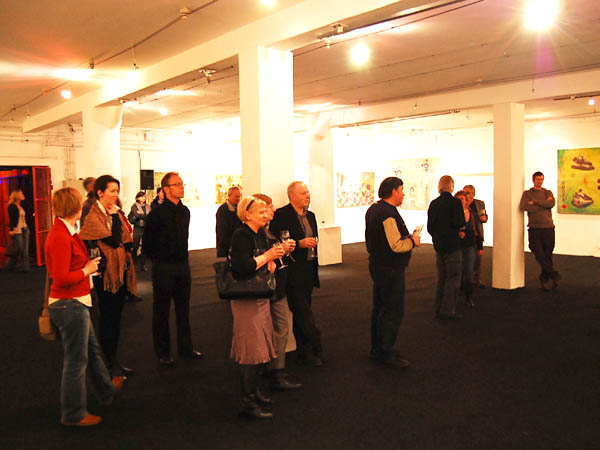Wernisażowa publiczność tym razem była mieszana. W tym samym czasie w Fabryce Trzciny odbywał się koncert jazzowy na rzecz Sławka Kulpowicza, przygotowany przez jego przyjaciół, a opatrzony wsparciem medialnym Radia Jazz, które także patronuje naszej galerii. Stąd wymieszanie było tylko pozorne, bo wielu jazzomaniaków to jednocześnie osoby aktywnie interesujące się plastyką. Mariaż z koncertem był jednym z powodów, dla którego wernisaż mile rozciągnął się w czasie.