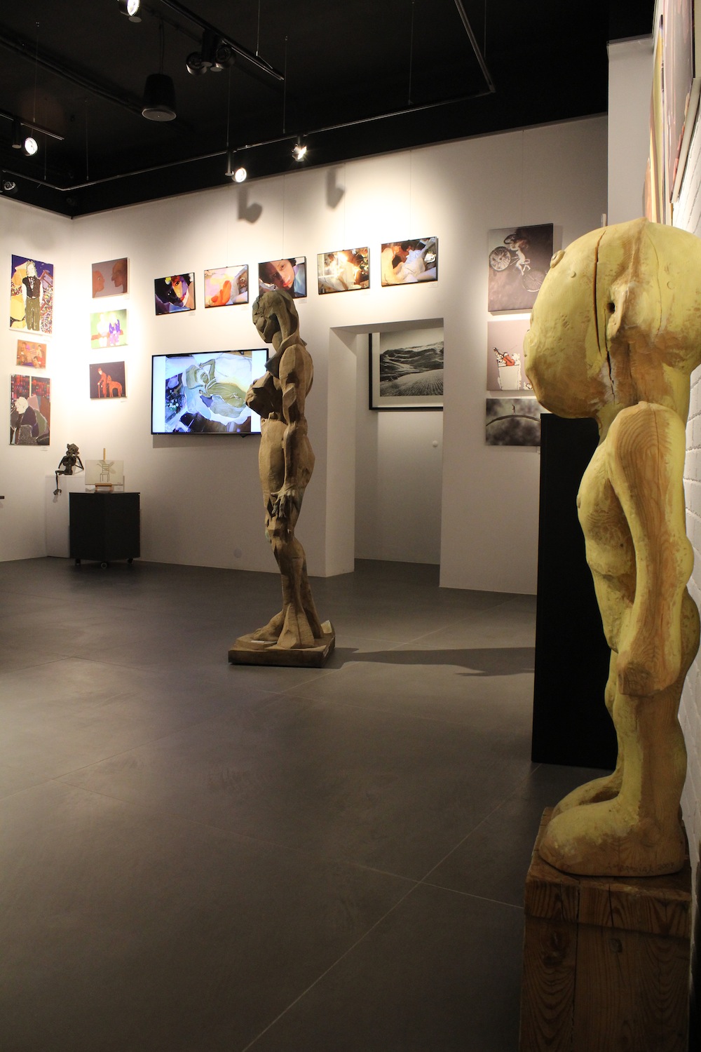 Joanna Szczepkowska wystąpiła w nowej, zaskakującej roli autorki prac plastycznych. Po raz pierwszy zdecydowała się na upublicznienie swoich rysunków w 2000 roku. Wykorzystała je w zbiorze felietonów Drugie podwórko. Delikatne niczym pajęczyna, w sposób aluzyjny odwoływały się do treści poszczególnych tekstów, lub stanowiły rodzaj dyskretnego ozdobnika. Taki był początek artystycznej przygody, która z czasem przerodziła się w autentyczną pasję. Rysunki Joanny Szczepkowskiej przyciągają wzrok wyrafinowaną prostotą i czystością formy. Wizualnie urodziwe, działają na wyobraźnię, prowokują do rozszyfrowania treści zapisanych na nieskazitelnej bieli papieru nieomylną czarną kreską. Nie szuka wielkich tematów, odnajduje je w codzienności. Bohaterami jej rysunków są zwykli ludzie przeżywający swe małe lub wielkie dramaty. Anonimowi przychodnie, w tajemniczy sposób wyróżniający się z tłumu, ludzie z marginesu. Z natury jest ogromnie wrażliwa, przepełniona uczuciem empatii, stąd jej Pijacy i Menele są pełni życia, radośni; nie budzą odrazy, ale sympatię. Niektóre wątki prowokują do kolejnych opracowań. Tak, więc powraca wizerunek bezdomnego skrzypka. Przejmująca w swej wymowie metafora losu zagubionych, zapomnianych artystów… Postacie są zazwyczaj pozbawione atrybutów; autorka wprowadza je, kiedy uzna, że ich obecność buduje dramaturgię. Taką rolę pełni śmietnik, miseczka na jałmużnę i filiżanka stojąca na atrapie kawiarnianego stolika. Większość prezentowanych na wystawie rysunków, ma formę otwartą. Giętka, pewnie prowadzona linia jedynie częściowo wydobywa zarys postaci. Ale potrafi też zapętlić się w miękki celnie zdefiniowany kształt. Spotkamy również przykłady kompozycji budowanych przy użyciu krótkich odcinków pospiesznie położonej ekspresyjnej kreski. Nie budzi zdziwienia fakt, że wszechstronnie uzdolniona i wciąż poszukująca nowych form wypowiedzi autorka, po długim okresie fascynacji rysunkiem, sięgnęła po kolor. Prezentowane na wystawie obrazy zostały zrealizowanie w ciągu trzech minionych lat przy użyciu techniki komputerowej. Graficznie czysty rysunek zastąpiła zróżnicowaną plamą koloru, położonego cienką matową warstwą lub gęstniejącego do emalierskich połysków. Eksperymentuje poszerzając zakres rozwiązań formalnych. Próbuje wypowiedzi w różnych konwencjach. Bywa oszczędna jak w moim ulubionym Swetrze, lub szczelnie na zasadzie horror vacui - zapełnia cały prostokąt kompozycji sylwetkami barwnie ubranych bywalców kawiarni. Znacznie poszerzyła i wzbogaciła zakres inspirujących ją tematów. Zaczyna rozwijać je w cykle. Warto w tym miejscu wspomnieć intrygującą serię prac, do której należy zaliczyć Ciało oraz jego powiększone do nadnaturalnych rozmiarów fragmenty - Usta i Ucho. W szeregu prac wykorzystuje fotografię (m.in. trzy Autoportrety). Wierzę, że zwiedzanie wystawy Joanny Szczepkowskiej było dla Państwa równie fascynującym przeżyciem, jak mój pierwszy kontakt z jej pracami.