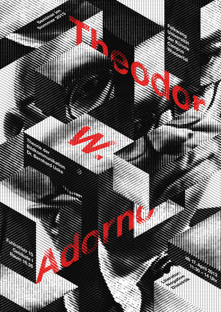 Plakat Andreasa Golde ilustrujący seminarium poświęcone dorobkowi Theodora W. Adorno oddaje delikatną konstrukcję pism filozofa w formie quasi-strukturalnych bloków. Ograniczona paleta kolorów, dyskretna typografia i technika rastra robią oszałamiające, niezapomniane wrażenie.