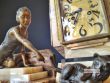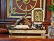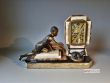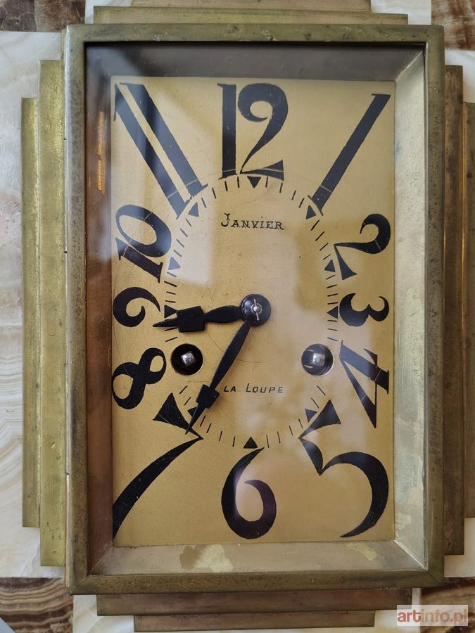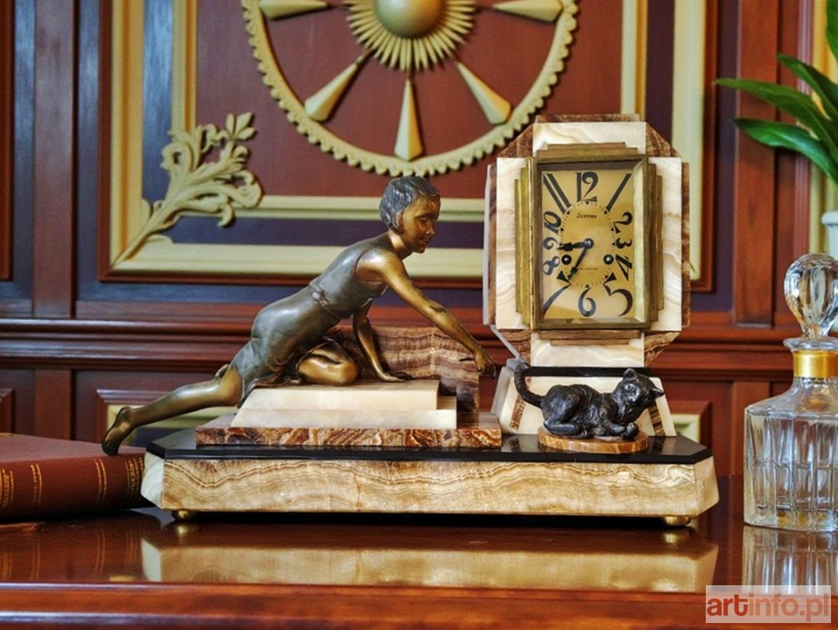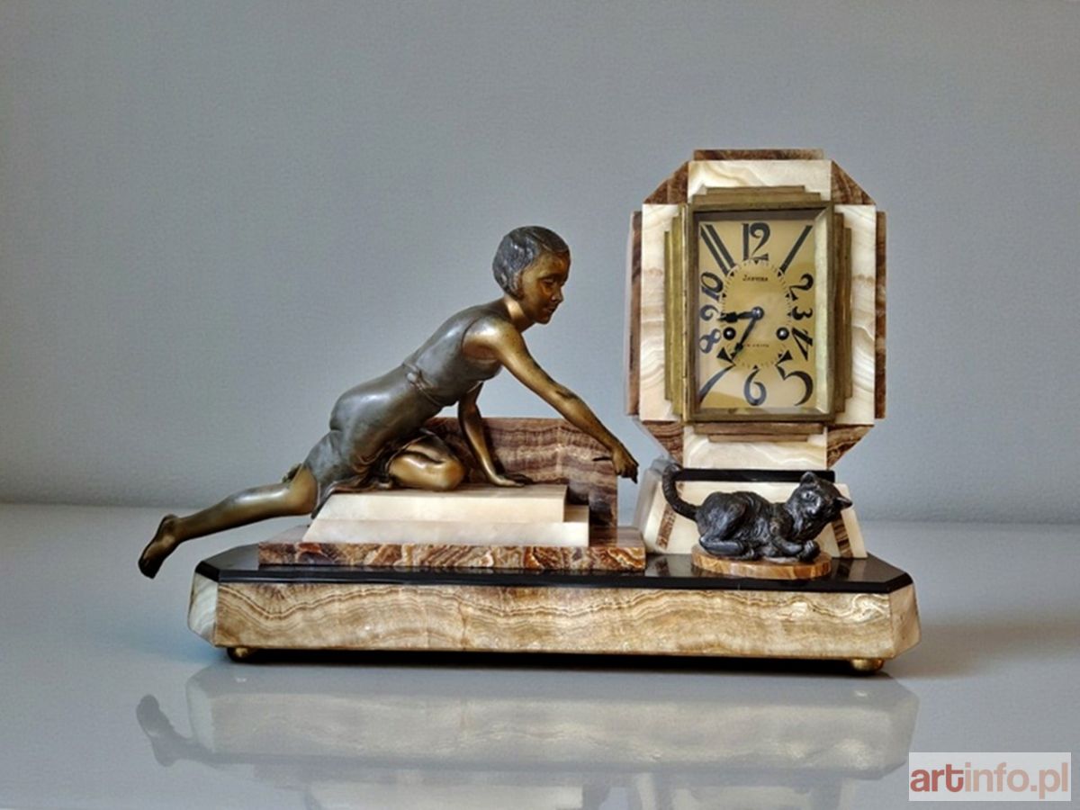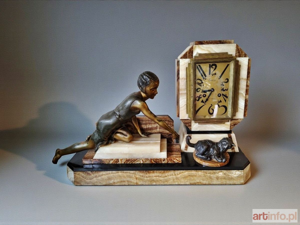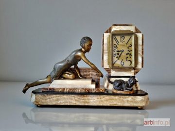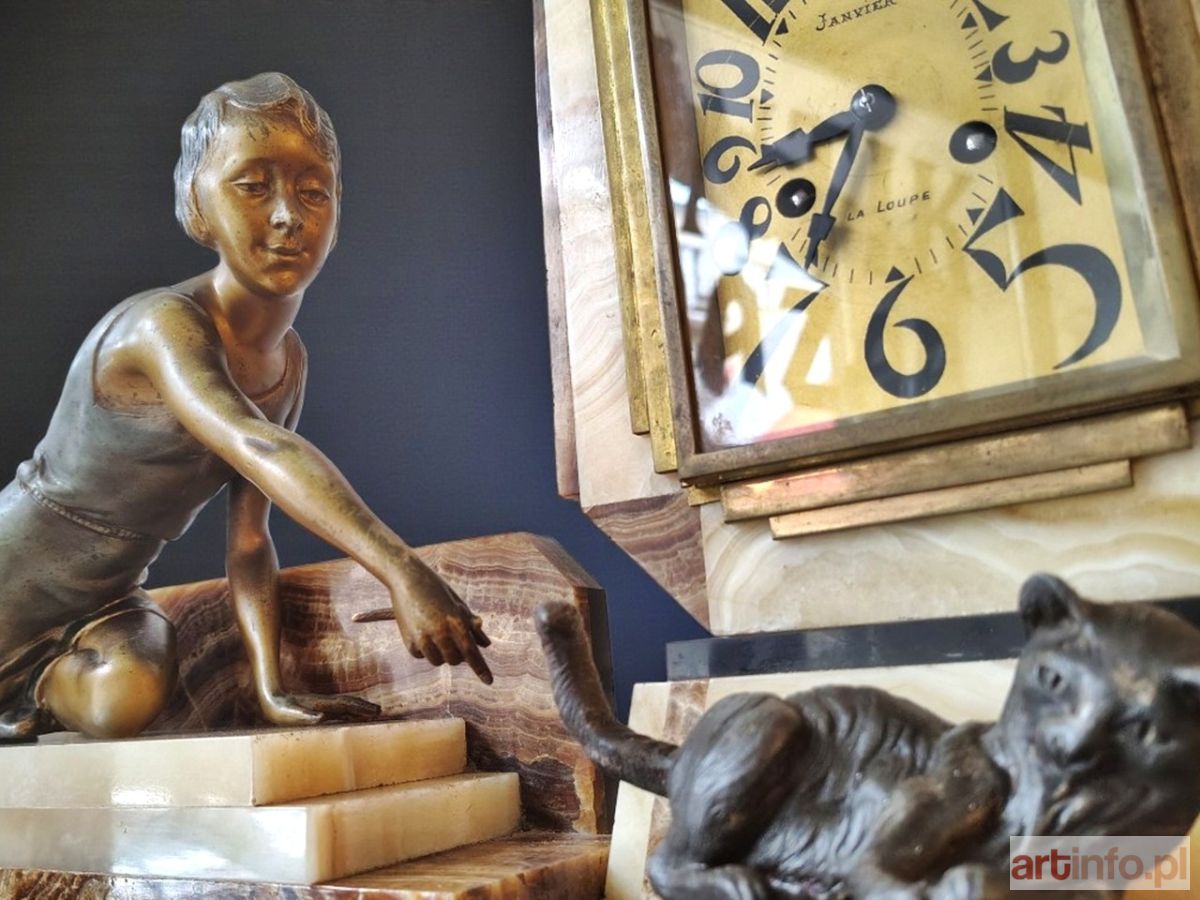 Obudowa wykonana z marmuru w dwu kolorach i czarnego granitu. Postać dziewczyny i kotka, wykonana z patynowanego metalu. Na tarczy zegara sygn. JANVIER La Loupe.