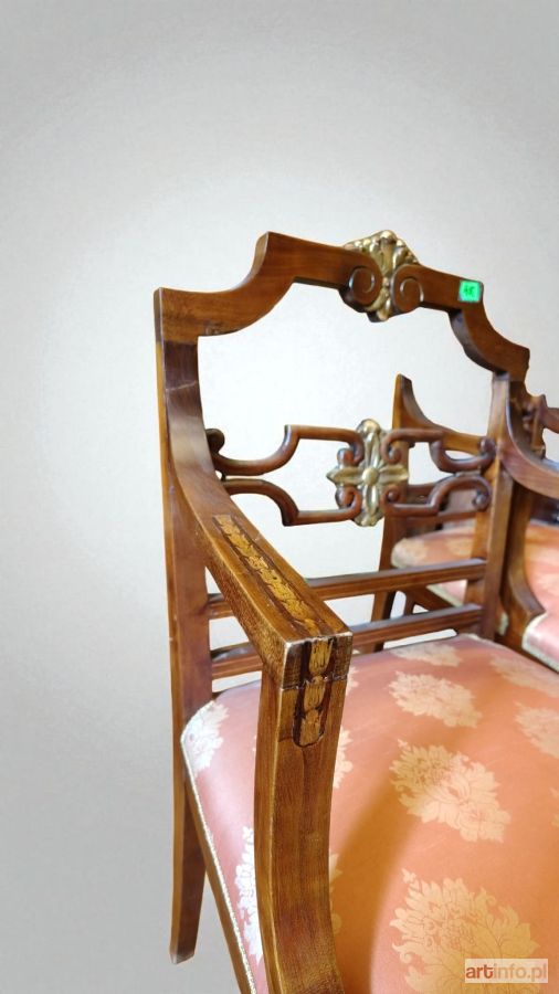 drewno mahoniowe, ażurowe oparcia, złote dekoracje, intarsje