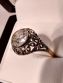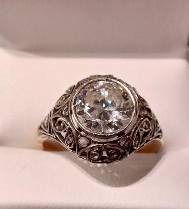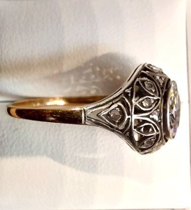 Złoty antyczny pierścionek z dużym okrągłym brylantem w starym szlifie, osadzonym w ażurowej srebrnej oprawie.