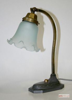 Lampka stojąca, I ćw. XX w., klosz oryginalny - szkło matowe biało-różowe, instalacja sprawna, regulacja ustawień klosza, możliwość funkcjonowania jako kinkiet. wys.: 28 cm Stan: bardzo dobry