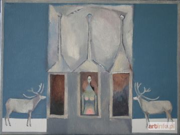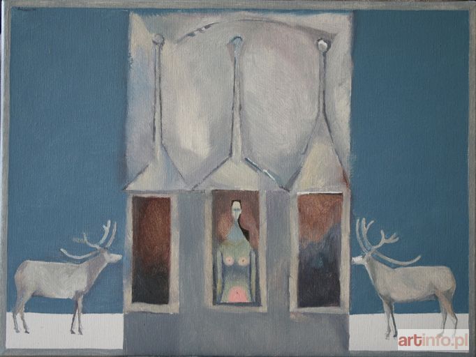 Praca z cyklu "Rykowisko", który powstał z potrzeby zmierzenia się z tematem uznawanym przez specjalistów za kicz. Obraz oprawiony w ramę.